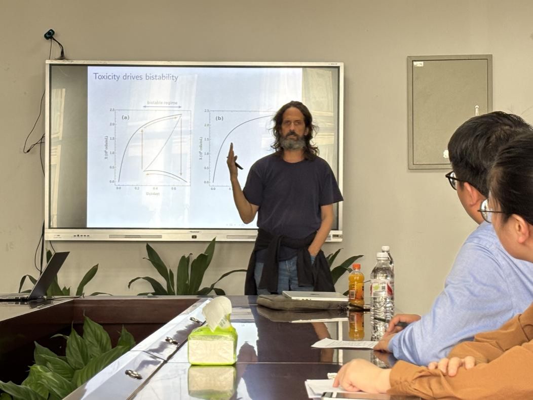 报告会上,Roberto Mulet教授介绍了一个创新的理论模型,该模型有力地证明了双稳态在简化的代谢网络模型以及哺乳动物细胞中的存在。Roberto Mulet教授团队通过一系列精心设计的实验,成功验证了理论模型的预测,进一步证实了双稳态在代谢网络中的关键作用。通过巧妙的数学建模和计算机模拟,其团队成功估算出了代谢过程中化学反应的通量密度分布。这一突破性的研究成果为深入理解细胞代谢的异质性和动态性提供了新的工具和方法,有望在生物技术和医学研究中发挥重要作用。报告结束后,与会师生与Roberto Mulet教授就代谢网络模型的构建、双稳态的生物学意义等问题进行了热烈的讨论和交流。
