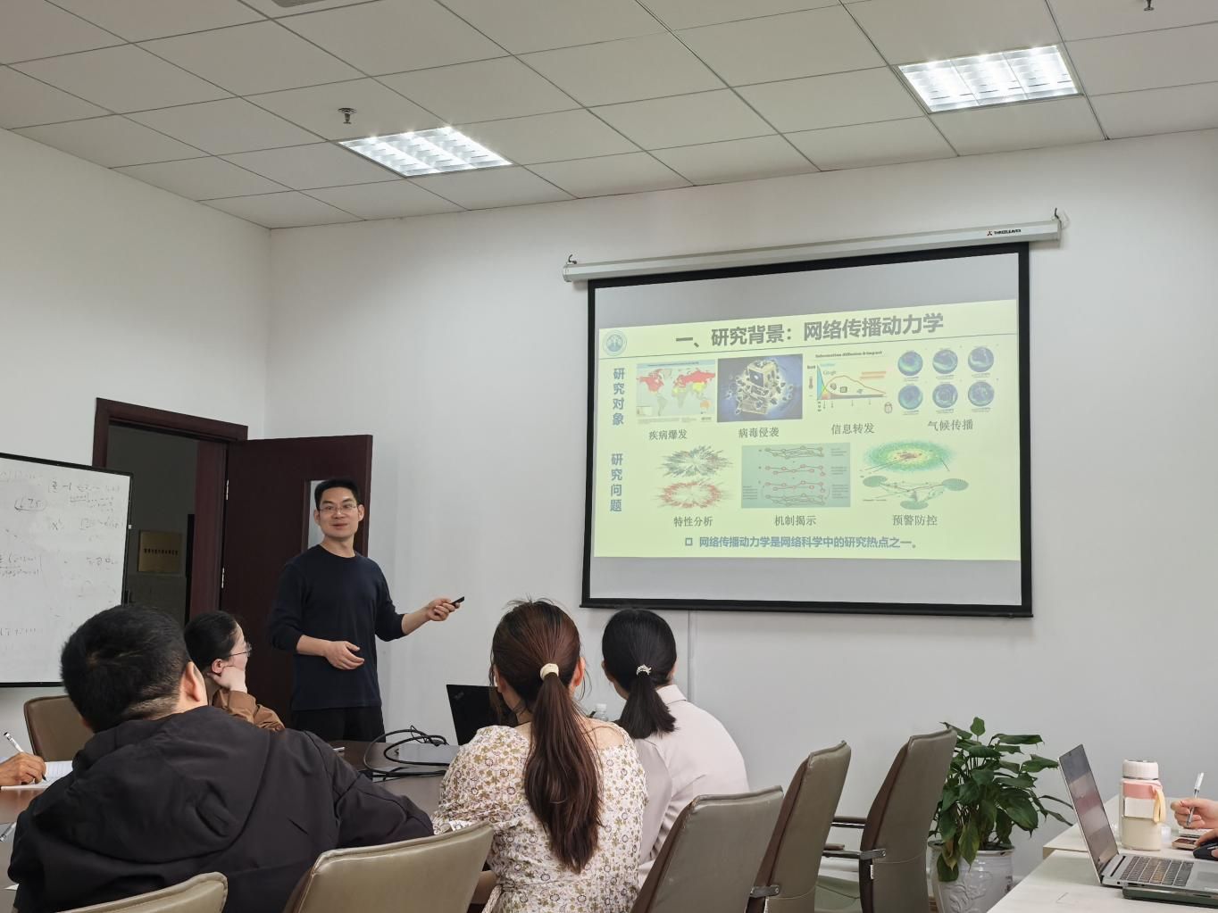 报告会上,唐明教授揭示了人类接触行为中普遍存在的非马尔可夫传播特性及其数学本质。针对现实系统中普遍观测到的接触间隔重尾分布、感染恢复参数时变等非马氏特征,研究团队创新性地建立了时变网络中的非马尔可夫传播动力学统一框架。研究发现,当系统满足接触记忆深度与传播时间尺度的特定匹配关系时,时变网络的非马氏传播过程可等价于静态网络的马尔可夫传播,且该等价性独立于底层网络拓扑结构。此外,通过构建单纯复形上的高阶传播模型,揭示了高阶交互中非马氏恢复机制对系统相变的调节作用。报告会结束后,与会师生围绕非马氏特征的实证测量方法、拓扑无关性定理的实际应用边界以及高阶恢复机制在流行病防控中的策略转化等前沿问题,与唐明教授展开了热烈讨论和交流。