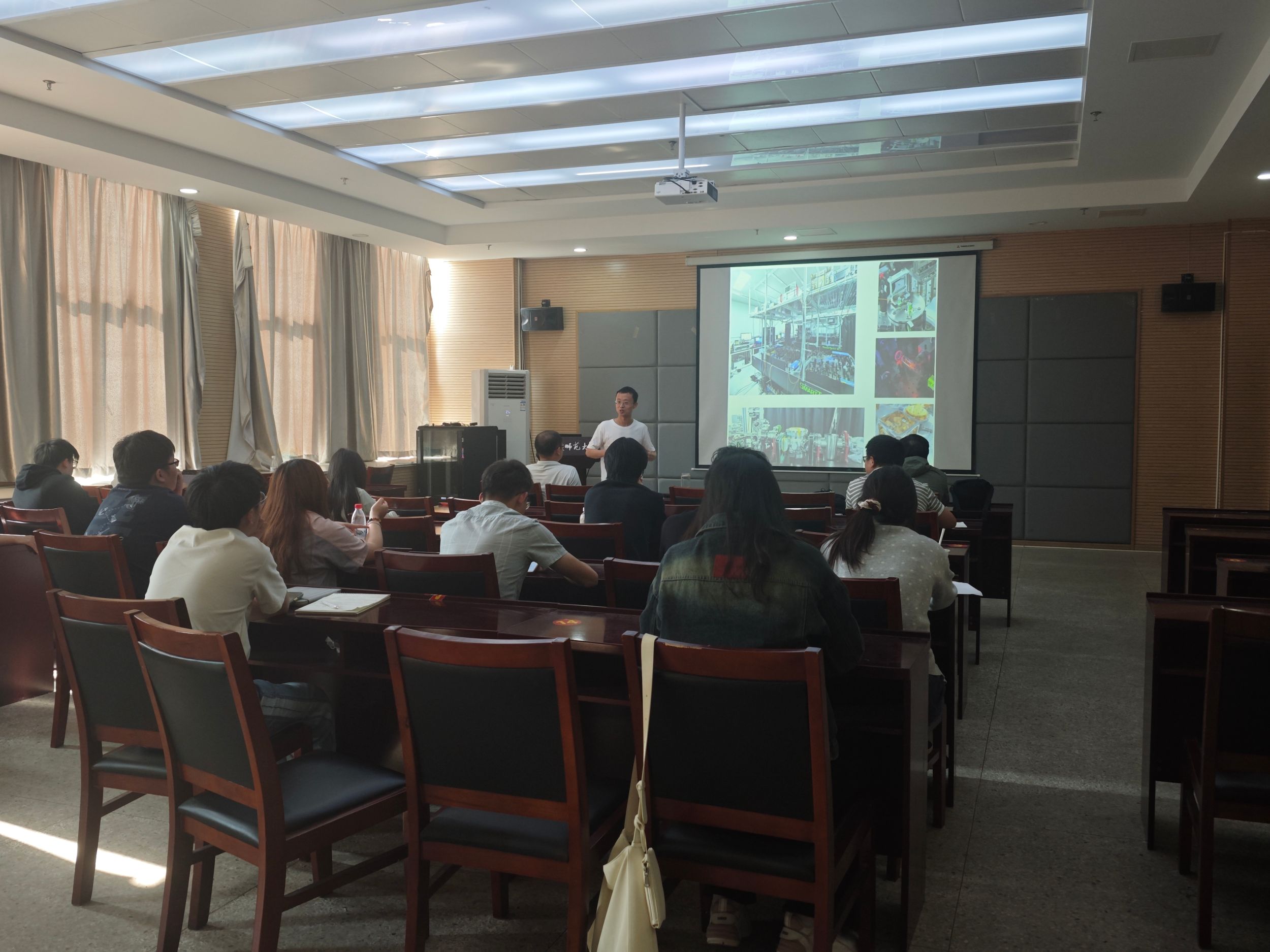 报告会上,张昊研究员阐述了在电磁学、光学、声学中,谐振腔主要用于放大信号;在量子信息科技领域,可以利用光学谐振腔来增强光子与原子之间的相互作用,这种相互作用在实验中可以被放大几万倍,从而实现对原子与光相互作用的精准调控,达到单光子和单原子的精度。会上,张昊研究员同与会师生分享了团队的相关工作进展,利用一个光学环形腔与原子阵列的强耦合系统,生成了一个光学暗态。在这个暗态中,原子阵列激发生成光学腔的驻波,并且使光场的节点与原子完全重合,从而将原子完全屏蔽在光场之外。这种暗态避免了原子散射导致的光子损失,从而实现了高效的光子转换。该研究成果提供了一种基于原子阵列空间结构调控光子-光子相互作用的新方法,为全光量子信息处理和量子网络应用开辟了新的可能性,使谐振腔内实现了一种特殊的共振光场,光场为零的波节能够自动锁定在原子的位置。报告会结束后,与会师生就相关问题同张昊研究员进行了热烈讨论和交流。
