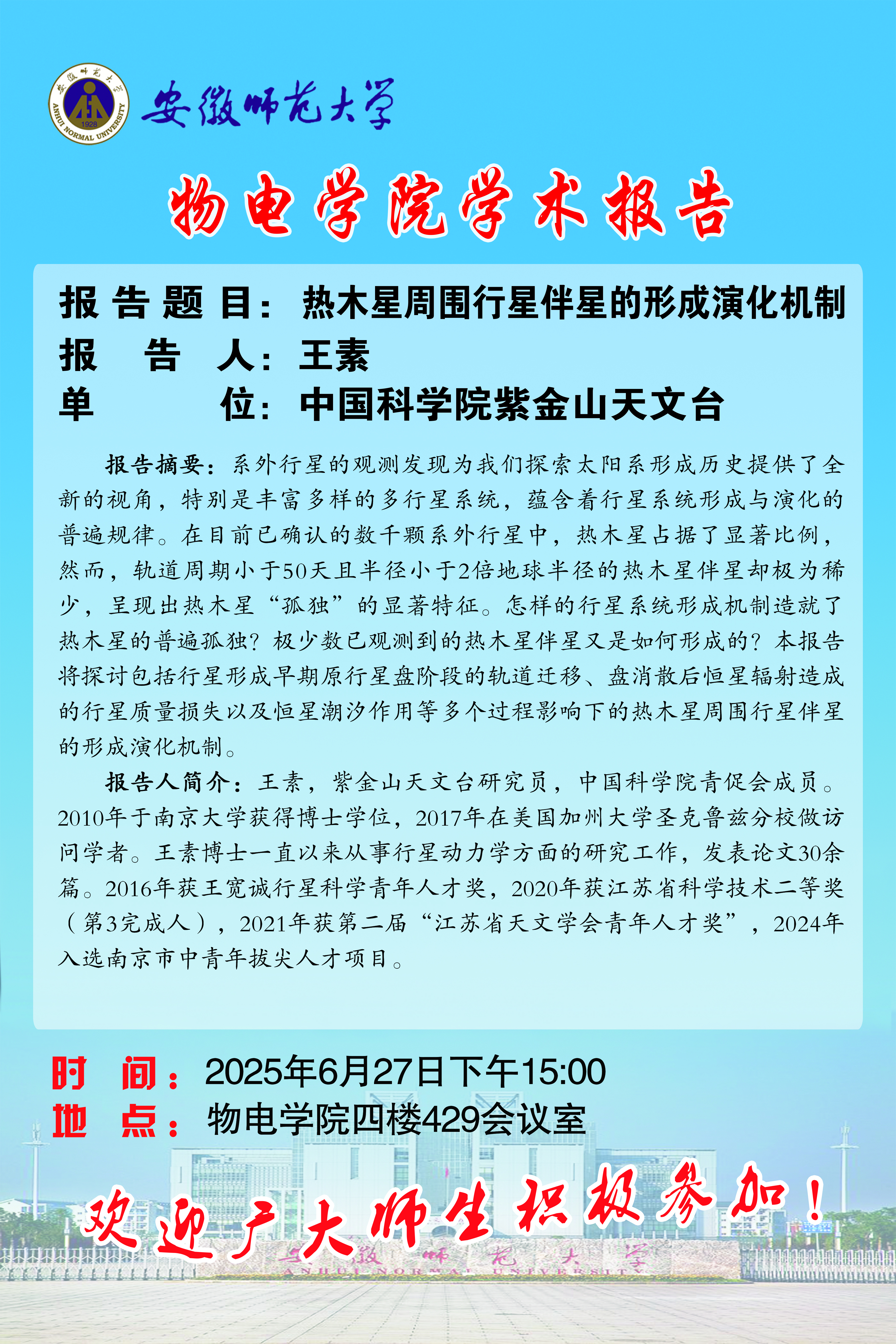 【学术预告】物电讲坛2025年第28期:热木星周围行星伴星的形成演化机制