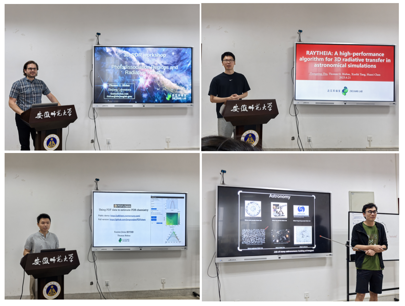 会上,之江实验室天文计算研究中心的高级研究专家Thomas Bisbas介绍了光致解离区(Photodissociation Regions, PDRs)的基本概念,以及其开发的世界领先、可模拟PDRs中物理及化学过程的3D-PDR软件,展示了此软件的一维及三维版本的结果以及对于星际介质演化的新理解。之江实验室天文计算研究中心的高级研究计算专家朱正平介绍了3D-PDR程序中用到的光线追踪,网格计算,并行计算,HDF5,三维版本等相关的原理和模块。之江实验室天文计算研究中心的副研究员蒋雪健介绍了分析3D-PDR模拟结果的PDFchem程序。云南大学李广兴副教授介绍了其对于包括3D-PDR结果在内的天文图像相关性分析的新手段。