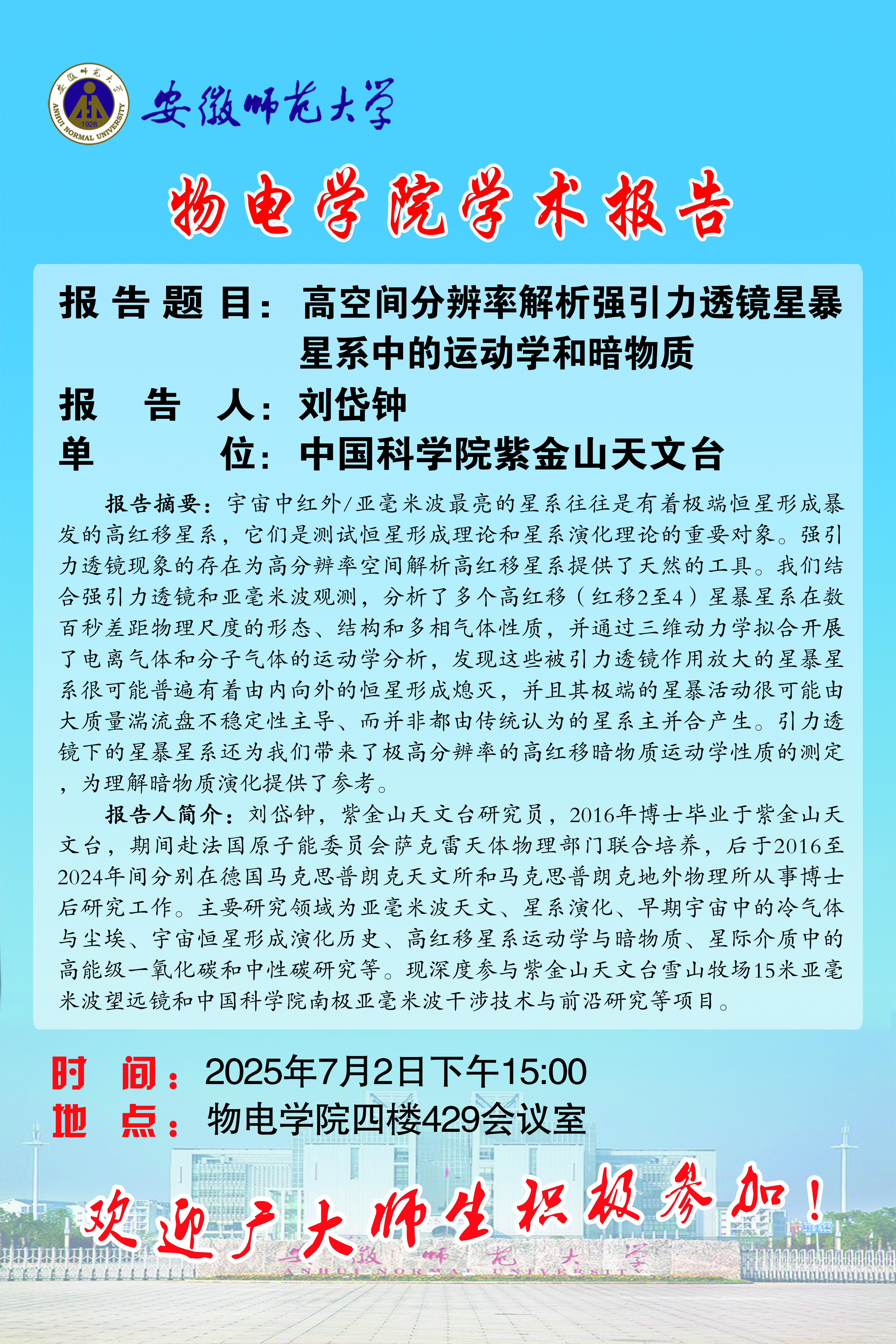 【学术预告】物电讲坛2025年第31期:高空间分辨率解析强引力透镜星暴星系中的运动学和暗物质