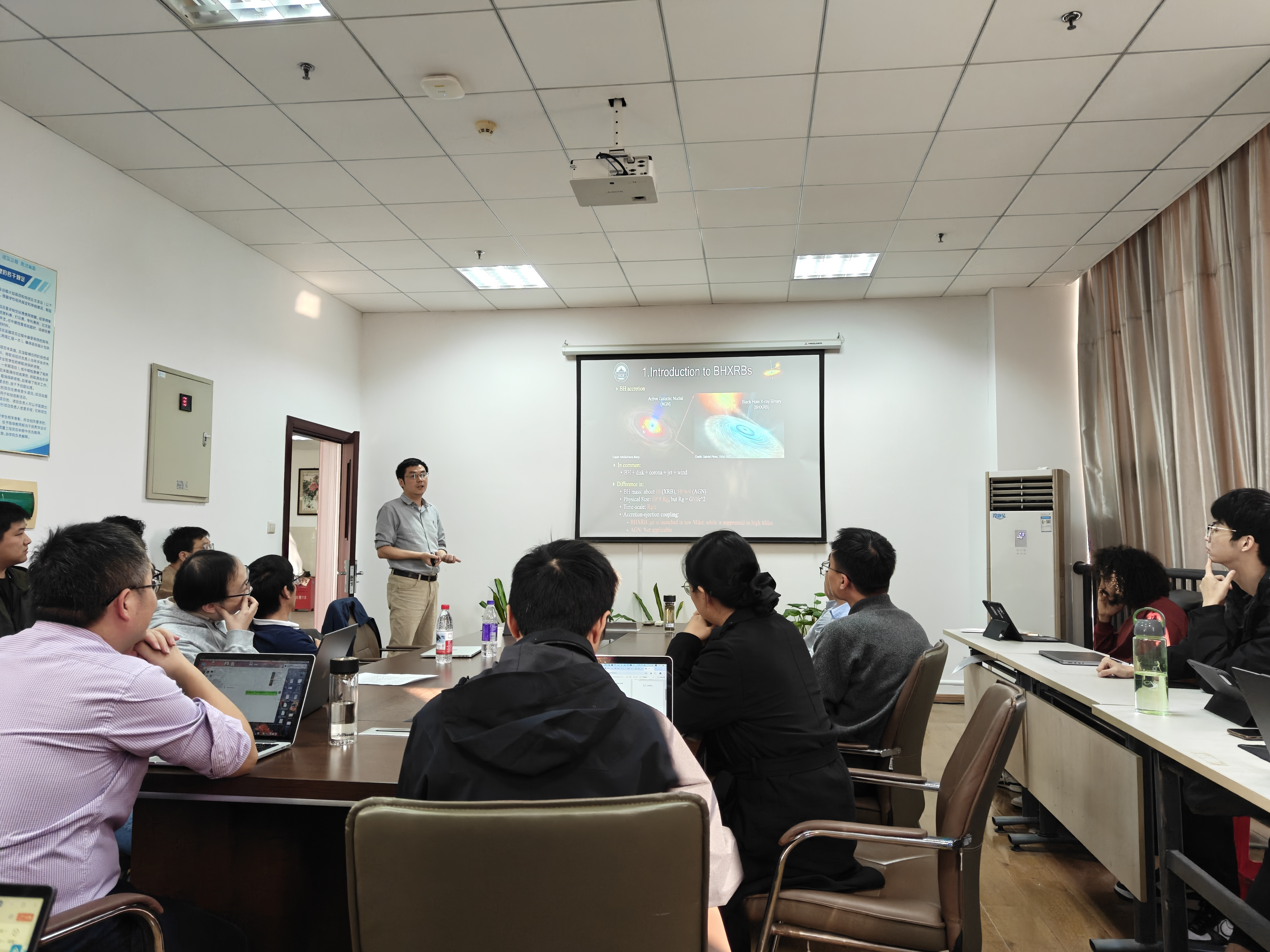 在报告中,游贝介绍了黑洞X射线双星(BHXRB)一生大部分时间处于辐射微弱的宁静态,当吸积流出现不稳定性而被触发爆发时,它会释放出从射电波到伽马射线的宽波段能谱。辐射的时变与能谱特征已清晰表明,其能量既来自吸积流,也来自相对论性喷流。然而,爆发过程中吸积与抛射如何共同演化仍不清楚。游贝从观测与理论两方面回顾BHXRB的爆发过程;随后介绍最新的两项研究:(i)热吸积流(即外流冕区)的动力学演化;(ii)磁阻塞吸积盘(MAD)的形成。这些工作将有助于更深入理解黑洞吸积物理以及吸积与喷流之间的关联。报告结束后,与会师生围绕相关议题与游贝展开了深入交流与讨论。