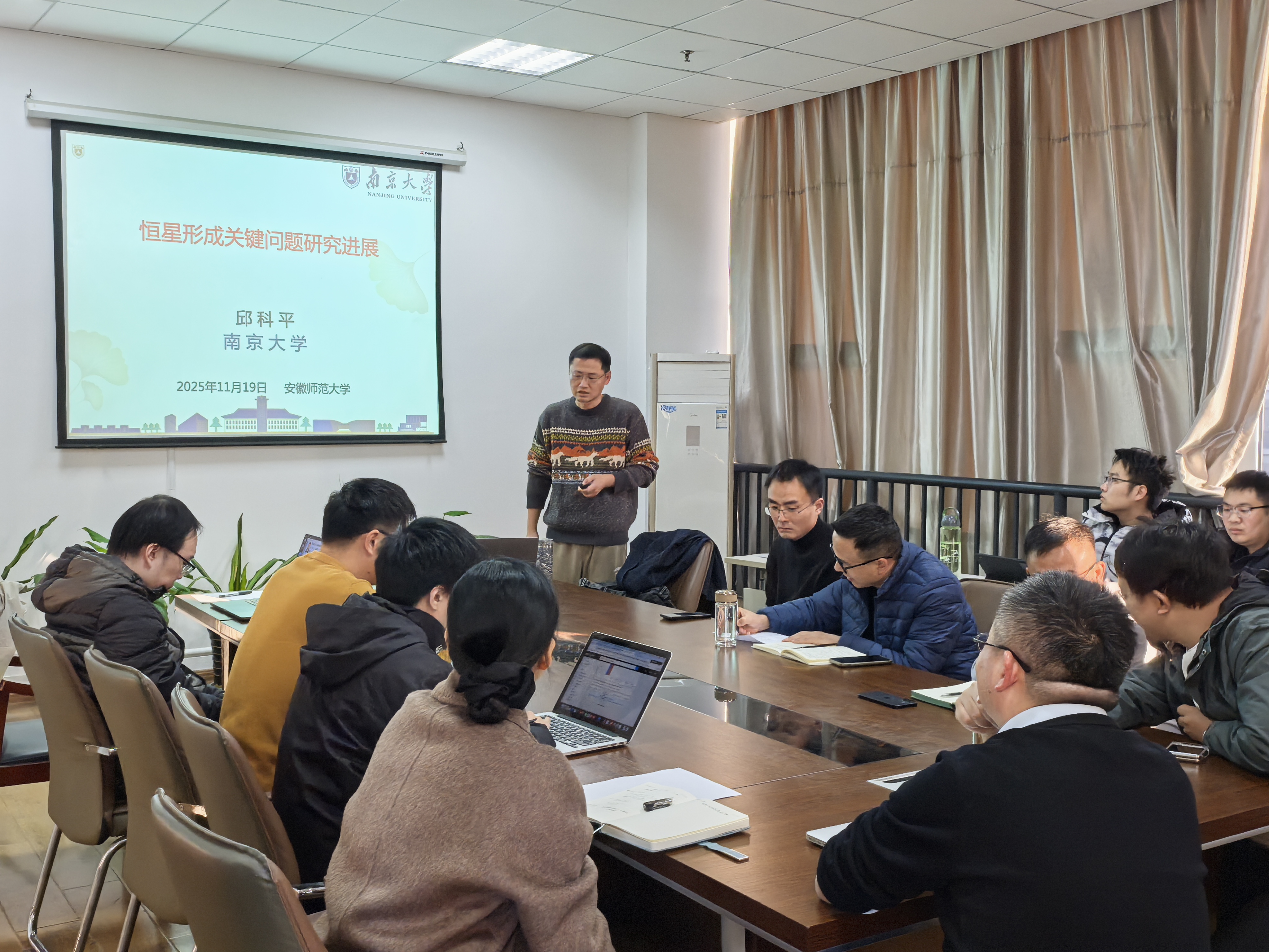 在报告中,邱科平从恒星初始质量函数与云核质量函数的相似性引出了恒星形成的疑难,结合自己团队多年的观测积累,重点介绍了引力、湍流、磁场在恒星形成过程中的作用。目前观测到的恒星形成大部分都是处于纤维状结构中,通过SMA等亚毫米波望远镜对天鹅座A区域的高灵敏度巡天,找到初始云核质量函数与初始恒星质量函数在小质量段不一致的证据。利用ALMA射电望远镜的高分辨率观测,发现云核在100AU的尺度都存在引力碎裂的情况。邱科平教授还介绍了他们团组对猎户座分子云不同区域的观测,显示大尺度磁场与小尺度磁场不一致的证据,并对可能原因进行了介绍。报告结束后,与会师生围绕相关议题与邱科平展开了深入交流与讨论。