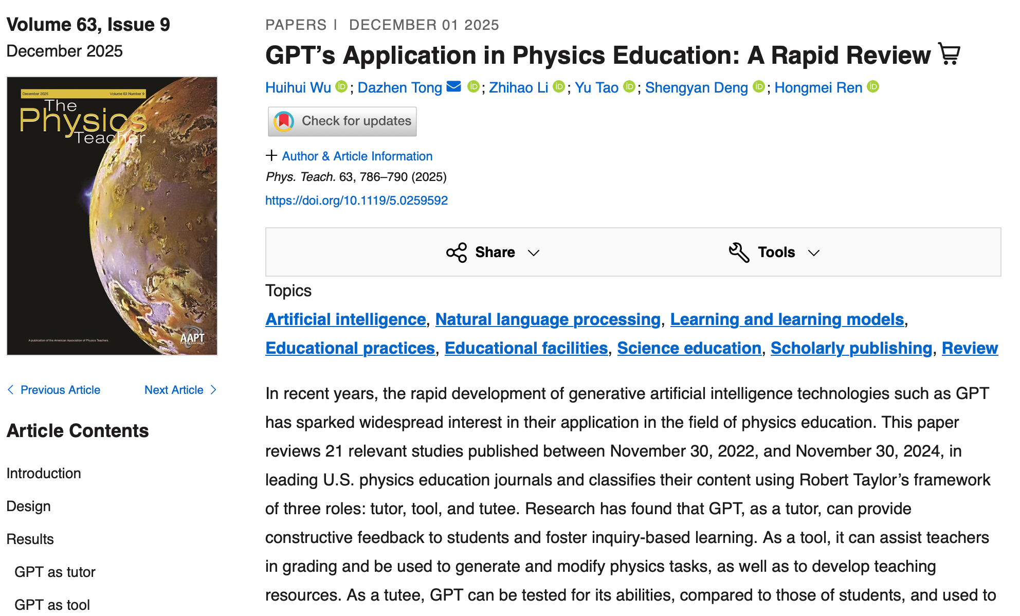 近日,我校必赢线路检测3003no1学科教学(物理)专业2024级硕士研究生武慧慧以第一作者身份,在国际物理教育高质量期刊《The Physics Teacher》上发表题为《GPT’s Application in Physics Education: A Rapid Review》的学术论文。该论文以必赢线路检测3003为第一署名单位,我院童大振老师为通讯作者。这是我院学科教学(物理)专业师生首次在该期刊上发表研究成果,标志着我院在物理教育研究国际化进程中迈出重要一步。