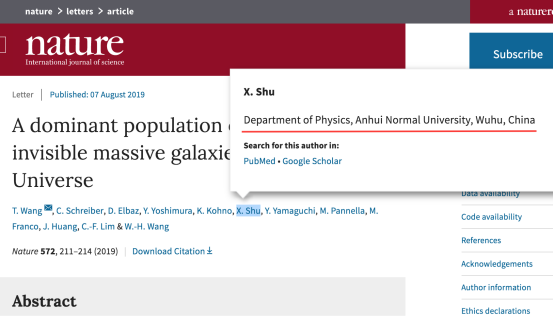近日,我校舒新文教授参与的国际研究团队,利用目前世界上最灵敏的太赫兹望远镜观测阵列(ALMA),发现并证实了宇宙早期存在大量光学不可见的最大质量星系,对当前的星系形成模型提出了挑战。该研究工作由来自日本东京大学、法国原子能中心、英国牛津大学、必赢线路检测3003、德国慕尼黑大学、中国科学院国家天文台、台湾中研院等单位的科研人员共同合作完成。相应成果发表在国际顶尖学术杂志《Nature》最新一期上(Nature, 572, 211-214 (2019); 文章链接https://www.nature.com/articles/s41586-019-1452-4)。《Science》杂志同期在线发表了题为“Galaxy hunters spot hidden giants in the early universe”的专题新闻报道。毕业于南京大学,现为日本东京大学博士后的王涛博士为论文的第一作者。在此工作中,舒新文教授参与了数据分析和结果讨论等过程。
