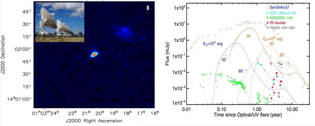 (左图:厘米波干涉图像;右图:厘米波射电喷流辐射与理论模型的比较)