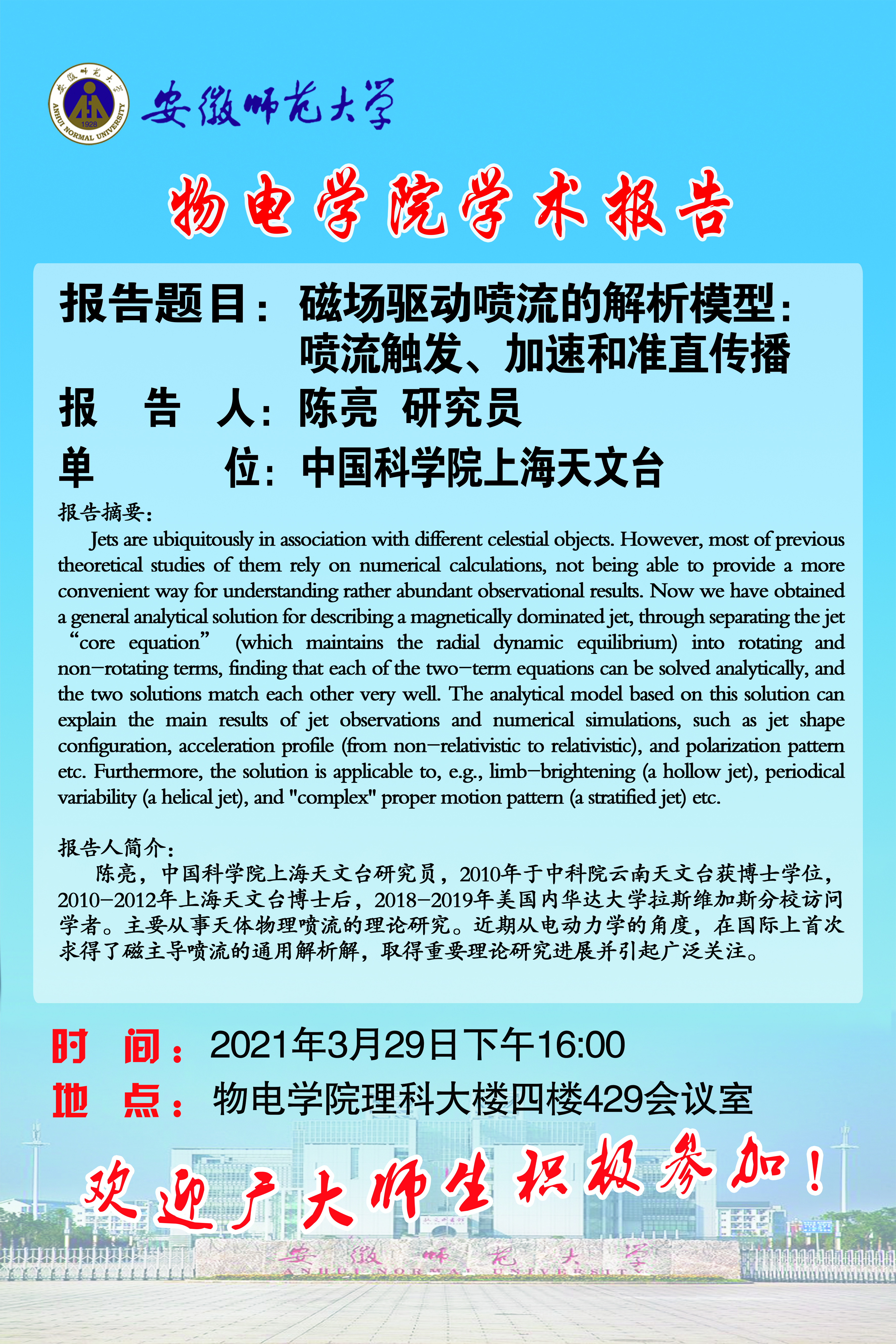 【学术预告】陈亮 研究员:磁场驱动喷流的解析模型:喷流触发、加速和准直传播