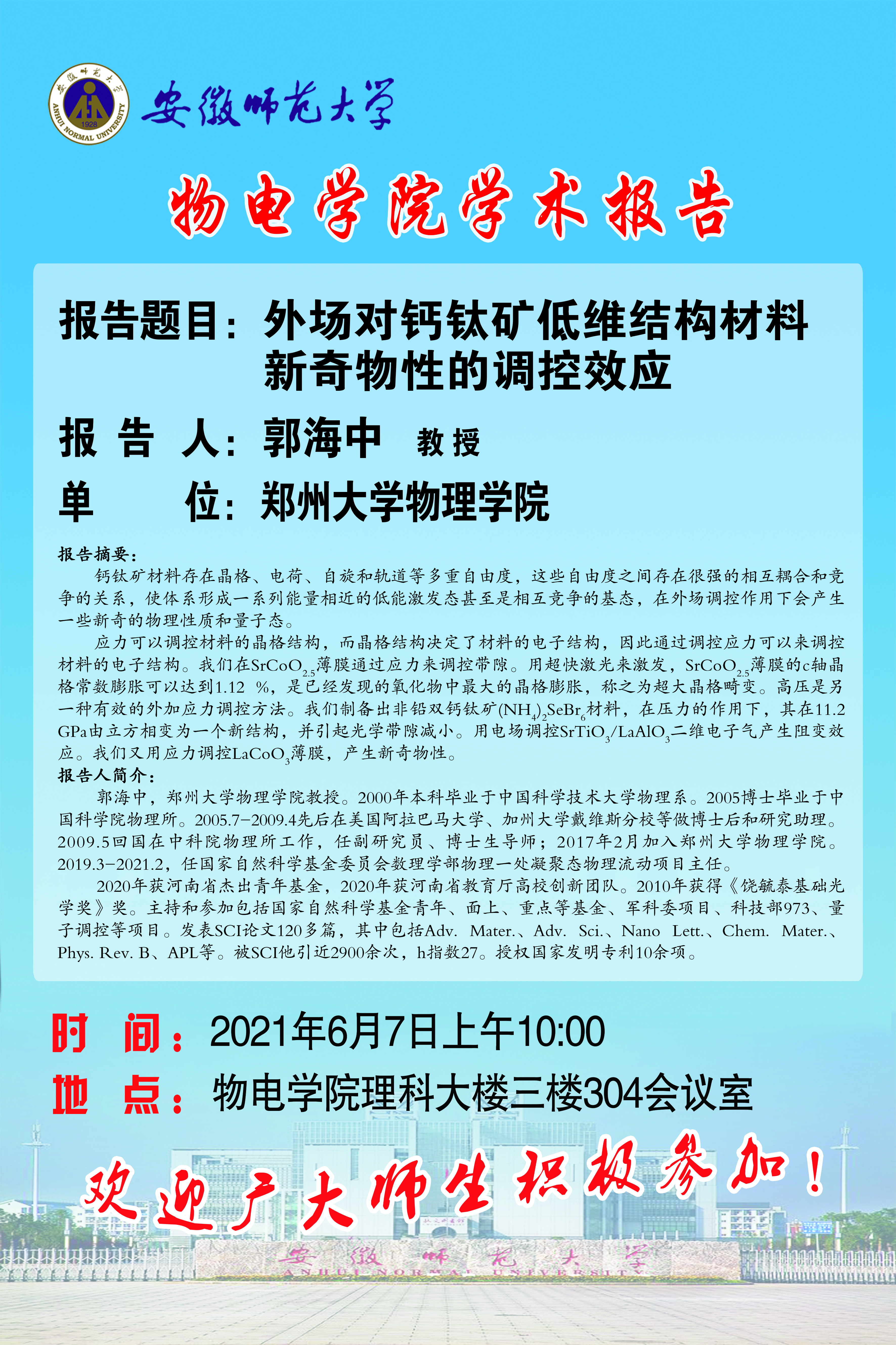 地址:花津校区-安徽省芜湖市九华南路189号 邮编:241000 电话:0553--3869894