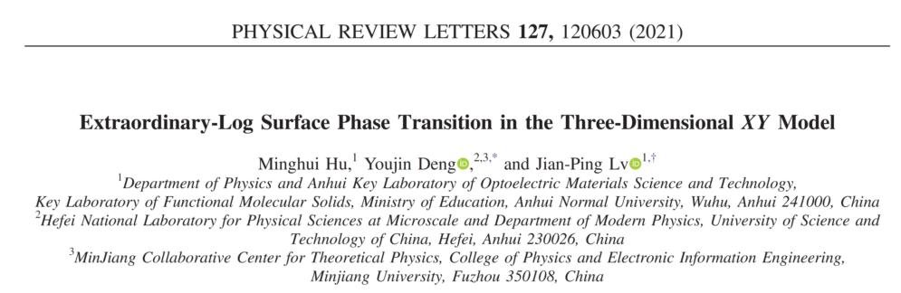 近期,吕建平教授课题组与邓友金教授针对O(2)模型的非凡表面相变开展深入研究,致力于探索该相变的新奇对数标度行为。该团队借助于大规模蒙特卡洛模拟,系统验证了强表面耦合O(2)矢量模型中对数临界指数的普适性和标度关系,由此证实对数普适类的存在性。在此基础上,该团队提出基于两距离标度的物理图像:关联函数体现两种对数标度行为的共存,即依赖于距离的行为和依赖于系统尺寸的行为,分别主导短程和长程区间,两种标度由不同的临界指数刻画。该研究结果已在《物理评论快报》(Physical Review Letters)发表,我校19级硕士研究生胡明辉同学是论文的第一作者【Physical Review Letters 127, 120603 (2021)】。