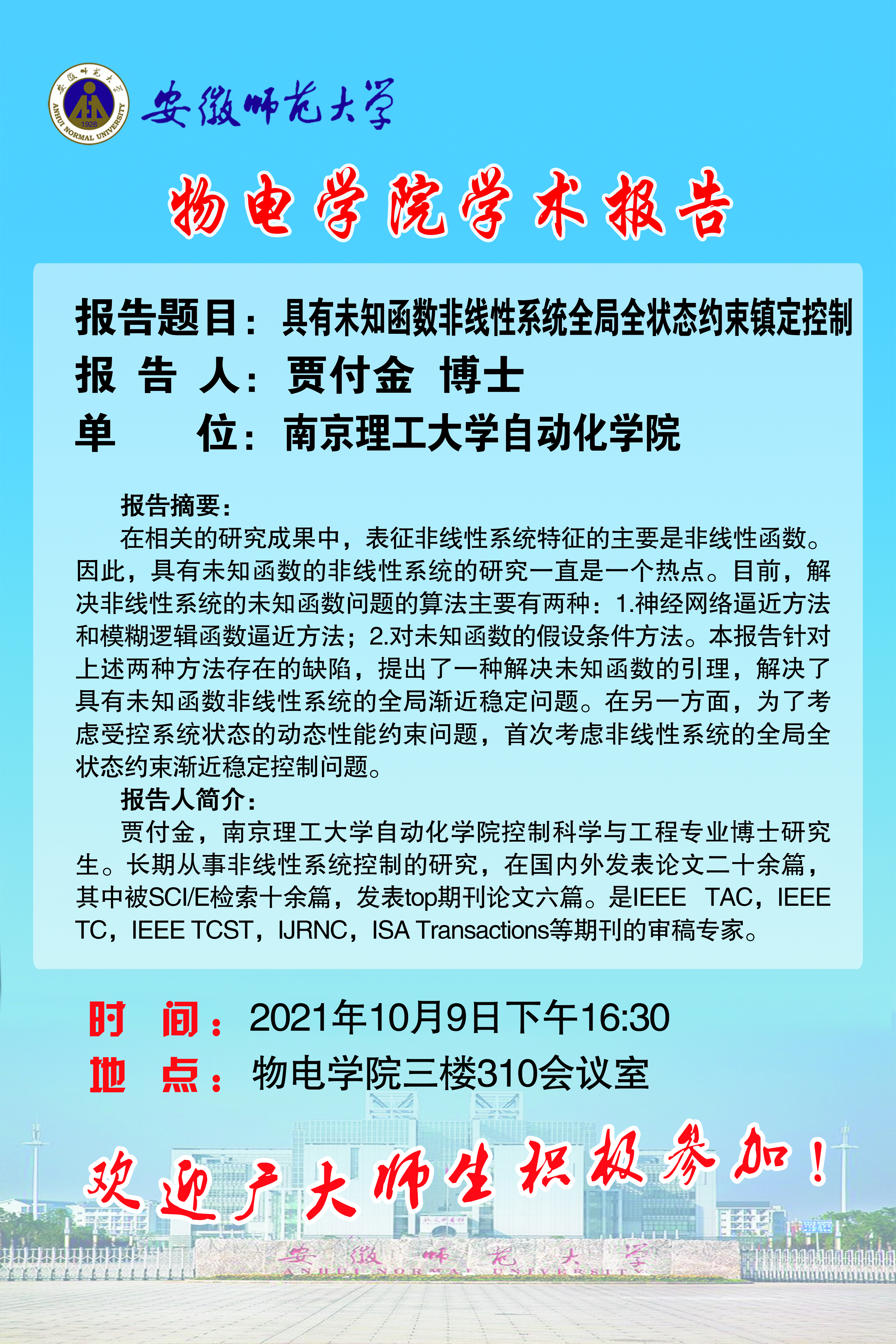 【学术预告】贾付金:具有未知函数非线性系统全局全状态约束镇定控制