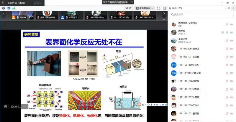 报告会上,周传耀研究员首先从化学与生活的密切关系切入,逐步过渡到化学科学的核心基础学科——“化学动力学”以及广受关注的表界面化学反应研究。围绕“表界面上化学反应的过程和机理”这一中心科学问题,周传耀研究员介绍了其课题组自行研制的两套科研仪器——“质谱&时间分辨双光子光电子能谱”和“基于高次谐波产生技术的时间分辨角分辨光电子能谱”,以及利用这些仪器设备在“TiO2表面光催化反应动力学”和“Au纳米颗粒等离激元催化H2+D2→HD反应”方面所取得的丰硕研究成果。除此之外,周传耀研究员还利用此次报告会的机会,详细介绍了中国科学院大连化物所最新的研究生招生政策,鼓励有志于科研事业的学生申请和报考。报告结束后,周传耀研究员与师生就相关问题展开了热烈讨论和交流。
