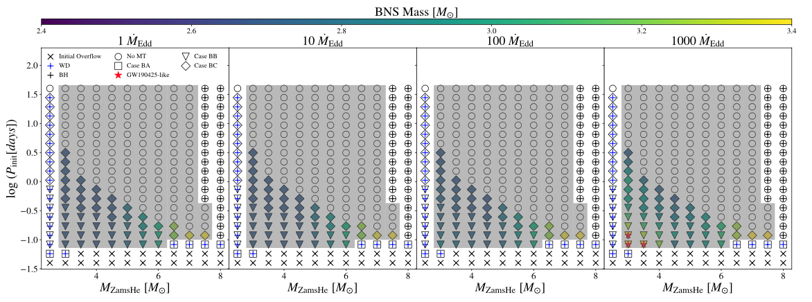 张莞婷同学一直对天文学有着浓厚的兴趣,依托“大创”项目,通过学习和熟练使用细节双星演化数值模拟工具MESA,借助必赢国际的算法服务器,长期开展了近1000多个双星系统演化的数值模拟,搜寻可以形成GW190425的演化渠道,成功发现在1000倍超爱丁顿吸积下大质量中子星系统生存的参数空间。研究还计算出该双中子星系统在形成之后可以通过引力波辐射最终并合成一个黑洞,对约束中子星的质量上限以及理解特殊引力波源的形成机制具有重要的科学价值。