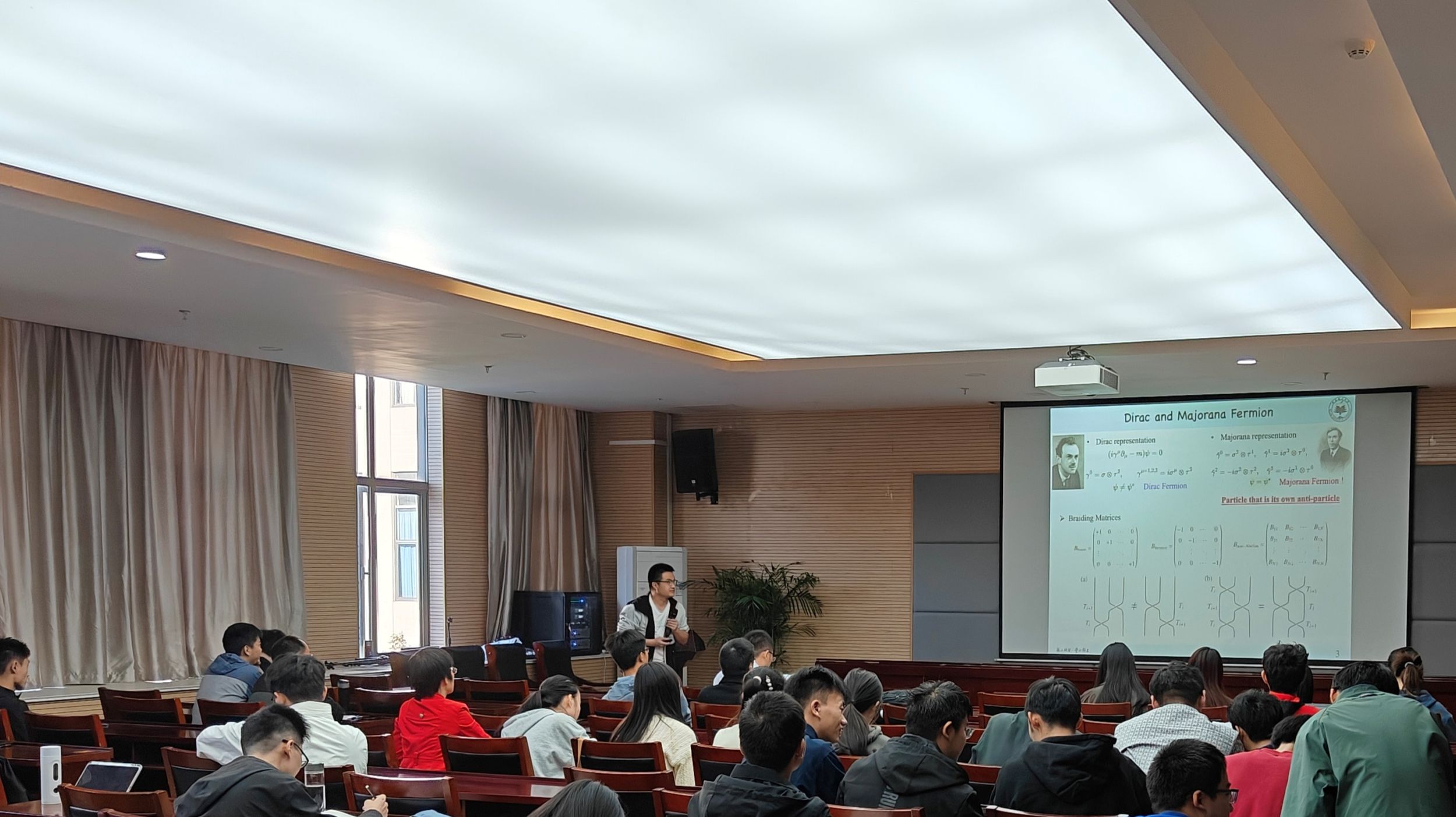 报告会上,刘铖铖教授做了题为《六角蜂窝结构体系的拓扑量子态研究》的学术报告。报告中,刘教授阐述了拓扑量子态和拓扑材料的研究背景及科学意义。同时,他结合课题组的相关工作同与会师生分享了二维大能隙拓扑绝缘体—硅烯、锗烯、锡烯,铋烷的理论预测和实验验证;二维高阶拓扑态的实现机制和丰富的材料预测;三维转角石墨烯中的高阶Z2狄拉克半金属态。