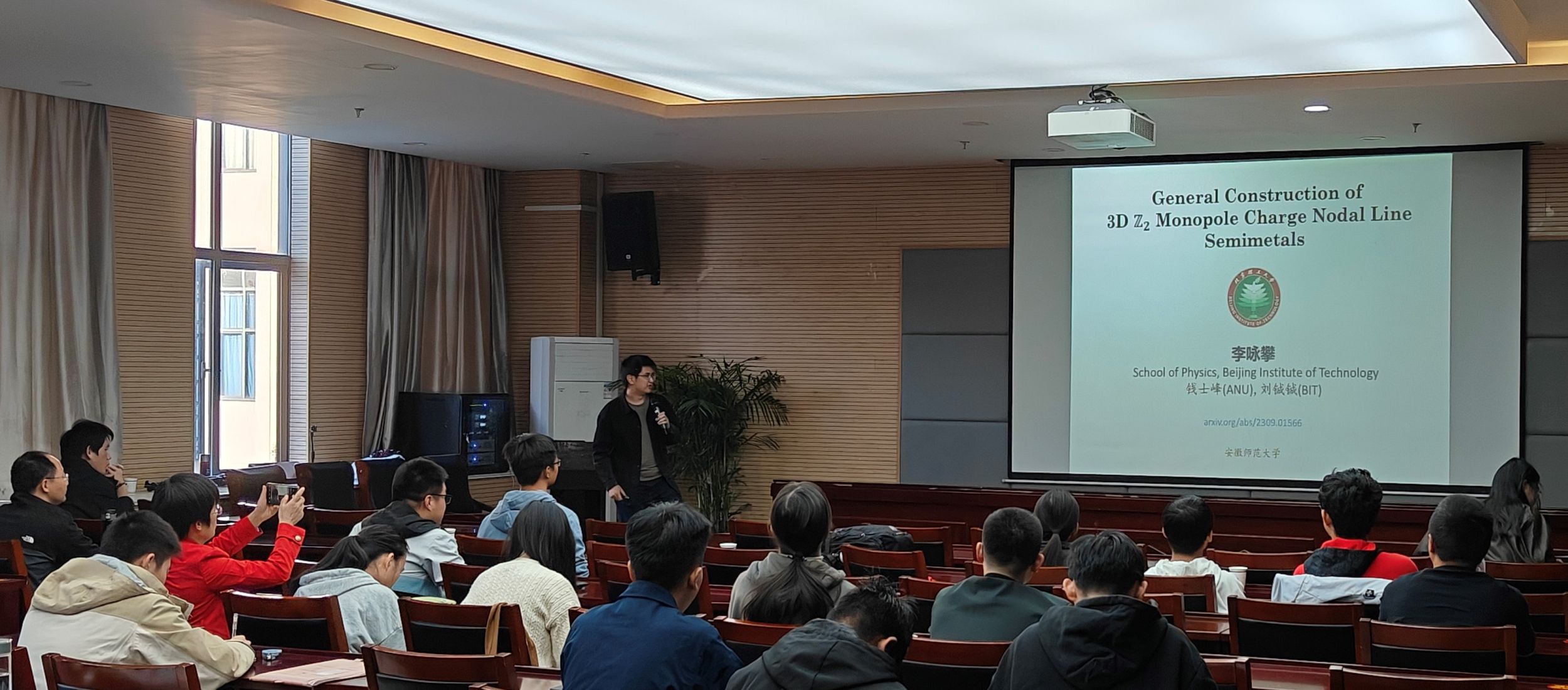 李咏攀博士做了题为《具有时空反演的三维Z2节线半金属的一般性构造》的学术报告。介绍了节线半金属理论的研究背景及意义;讲述了通过具有时空反演的二维狄拉克半金属一般性的构造三维Z2节线半金属。此项研究加深了人们对三维Z2节线半金属的认识和理解,提出了第一种可行的高通量搜索方法。