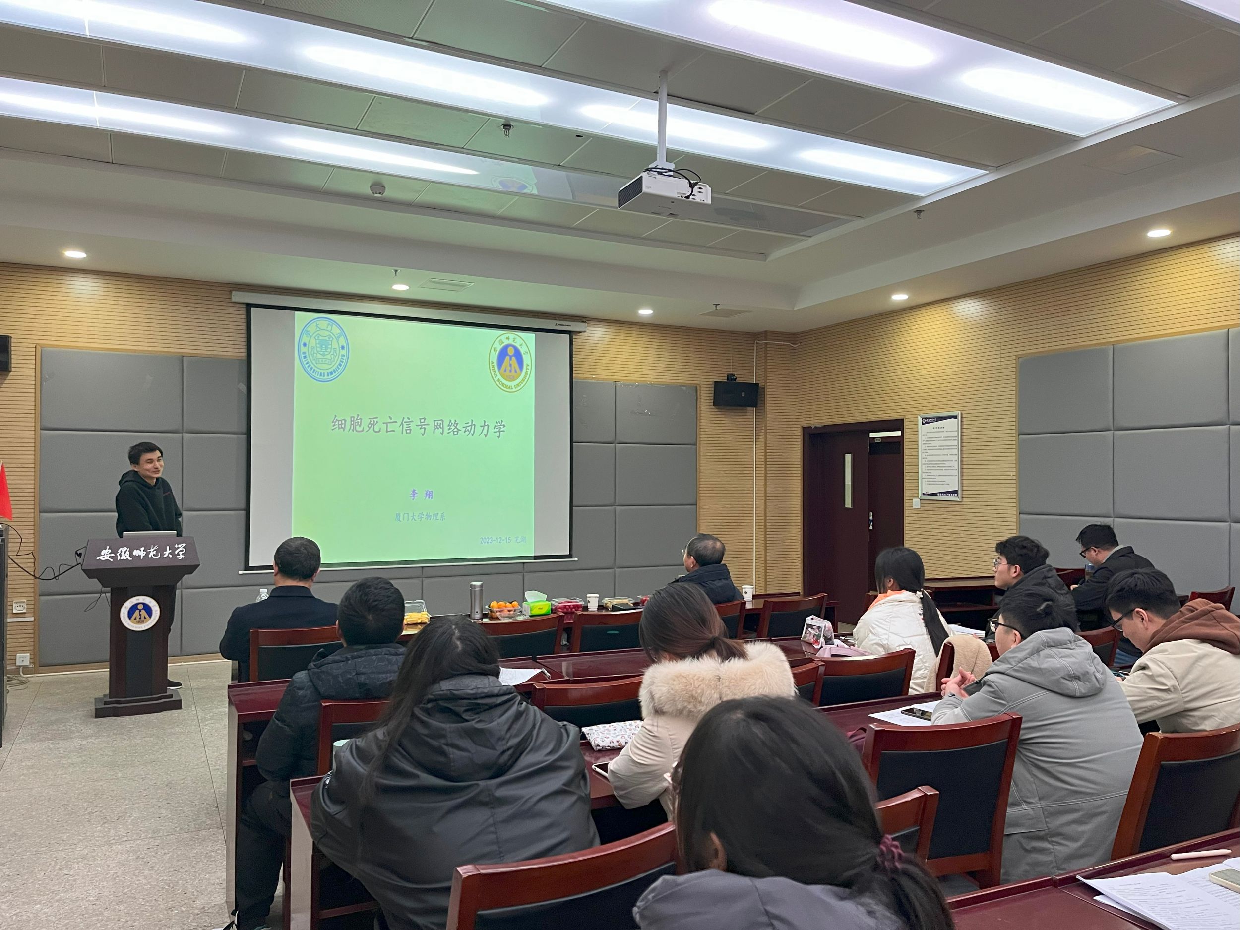 报告会上,李翔博士简要介绍了复杂系统、细胞、细胞信号网络、细胞坏死和细胞凋亡的研究内容及方法。随后,李翔博士结合相关工作同与会师生分享了课题组在细胞死亡命运的抉择机制等方面取得的最新理论研究进展,包括RIP1对细胞坏死的双相调控行为,RIP1对Caspase8和RIP3的不同动力学调控机制,双相-涌现调控行为的拓扑结构分析高阶大分子复合物组装动力学,以及深度学习在细胞死亡中的应用等。报告会结束后,与会师生就相关问题同李翔博士展开了热烈讨论和交流。