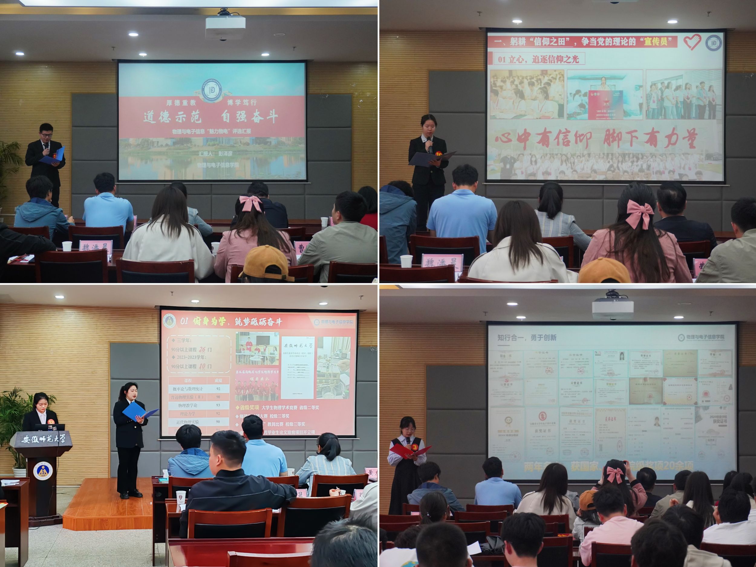 经个人申报、班级推荐,材料审核,共有17位优秀大学生进入展评环节。他们采用PPT汇报的方式向全体到会人员讲述了自己在专业学习、志愿服务、科研创新、技能竞赛、社会实践等方面的经历。汇报选手中,有的求知若渴,在学习与创新的道路上迎难而上,勇攀高峰;有的博施济众,用自己所学为社会做贡献,让知识在人民的土地上开花结果;有的敢做敢为,不惧未知,在创新实践的道路上披荆斩棘。一张张满载荣誉的PPT、一页页热血酸涩的成长记录、一句句激昂澎湃的奋斗誓言感染了台下的每一位评委和观众,展示了师大优秀物电人的样子,为后来者树立优秀榜样。