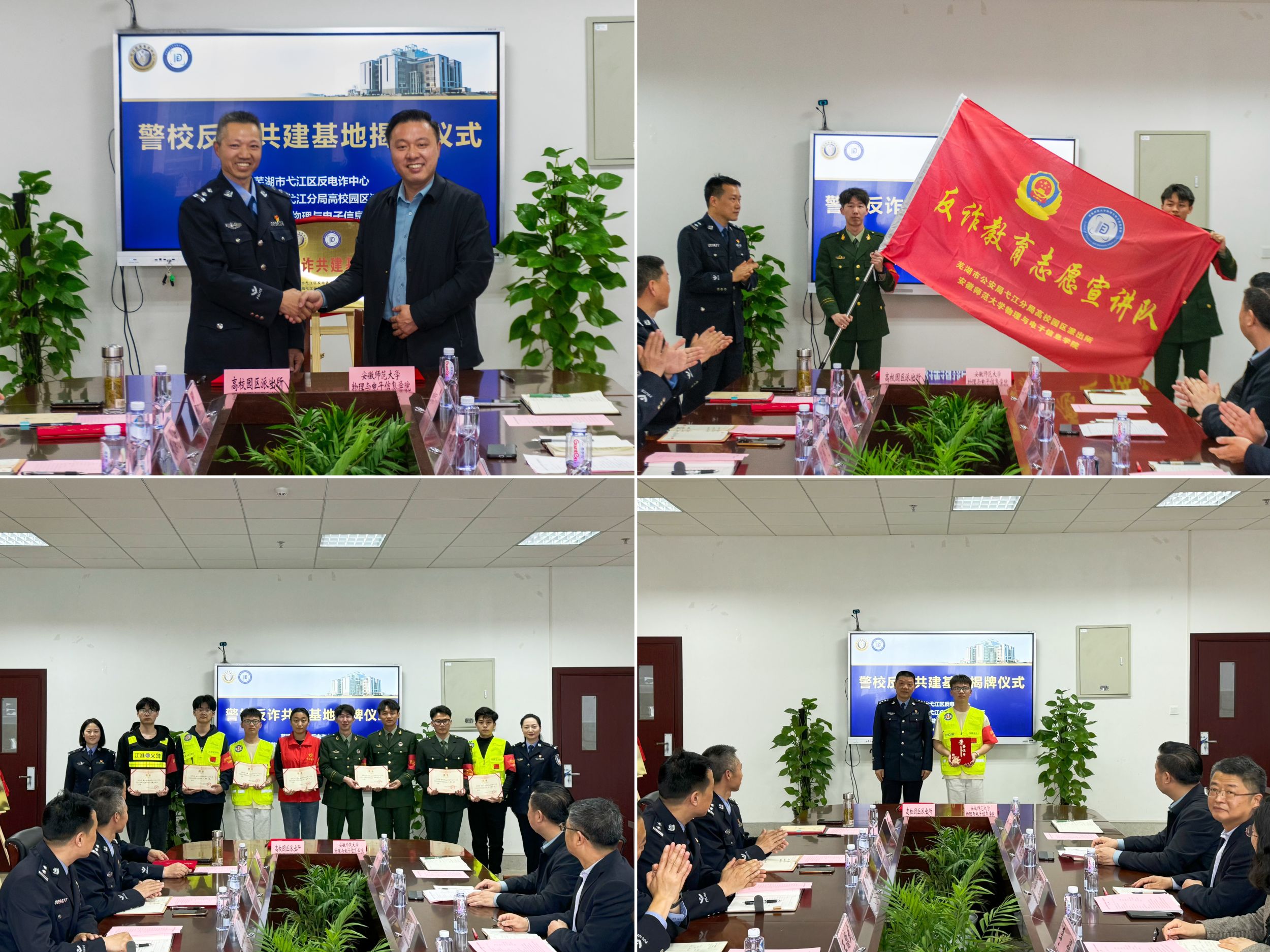 仪式上,王德武和唐俊生共同为警校反诈共建基地揭牌;李娟为反诈教育志愿宣讲队指导教师颁发聘书;朱滦河和黄友生共同签约合作框架协议;汪国飞为反诈教育志愿宣讲队授旗;王薇、郭俊洁为反诈教育志愿宣讲队义警志愿者颁发聘书;周英坤为2023年度优秀反诈宣讲学生志愿者颁发证书。