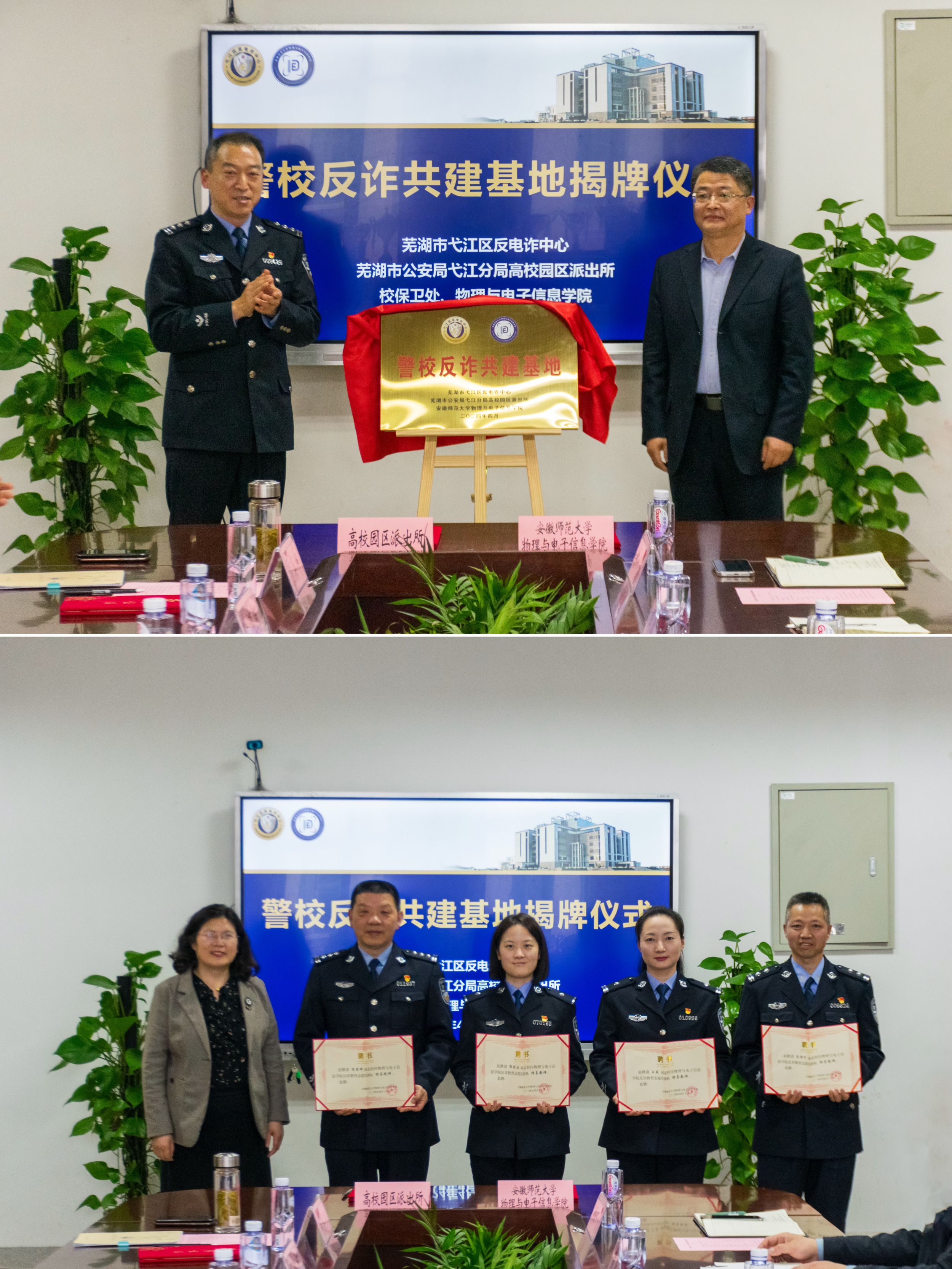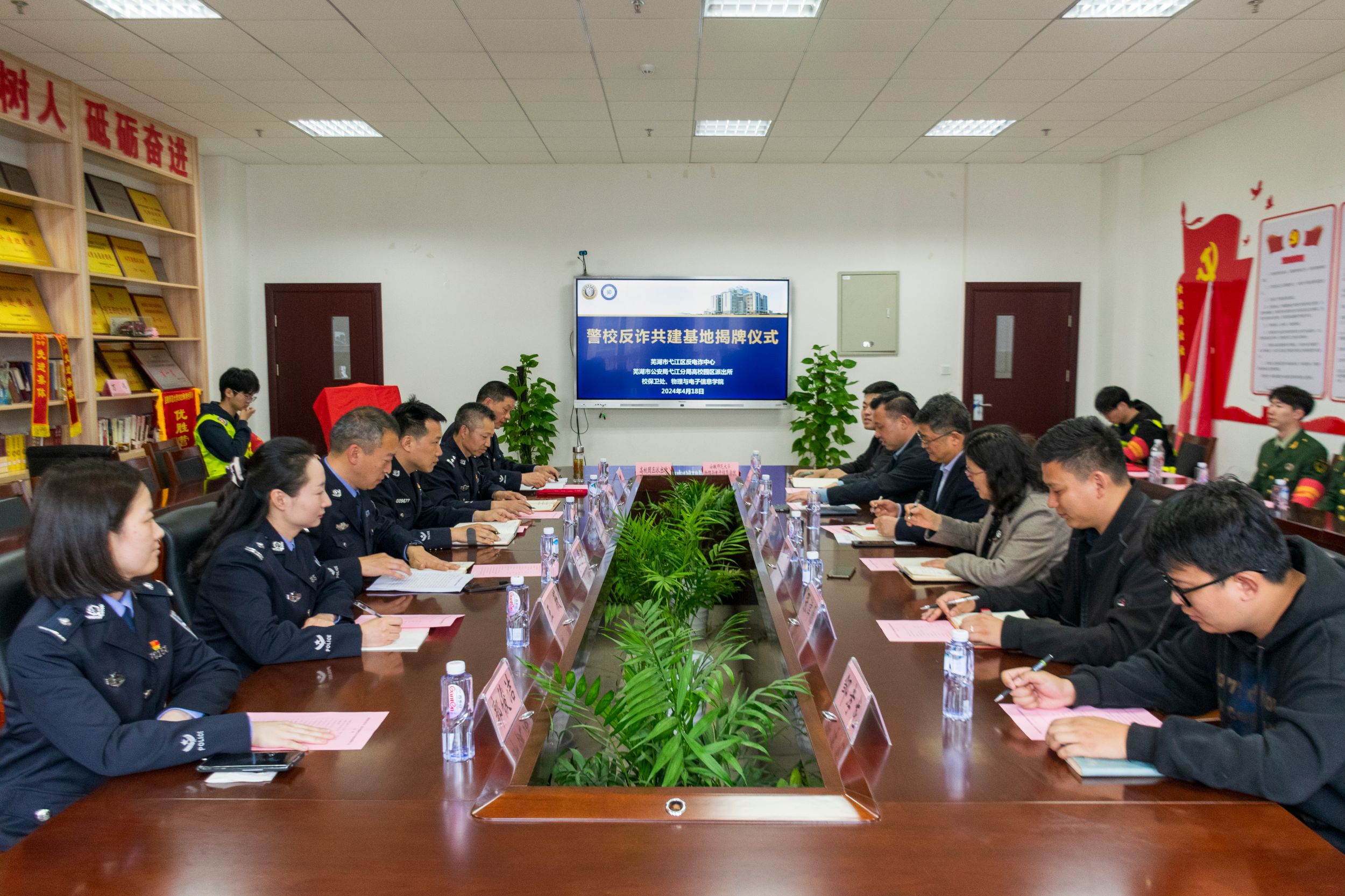 为切实推进“大学生护航行动计划”,深化警校联动开展反诈宣传教育合作,增强学生“识诈反诈”意识和能力。4月18日下午,必赢国际在物理楼308会议室举办了警校共建反诈基地揭牌仪式,高校园区派出所所长王德武,弋江分局综合打击队教导员汪国飞,高校园区派出所民警周英坤、朱滦河,弋江分局反诈中心王薇、郭俊洁,学校保卫处处长唐俊生,学院党委书记李娟,学院团委书记张津源及相关辅导员出席活动,学院反诈宣传教育志愿宣讲队成员参加活动。仪式由学院党委副书记黄友生主持。