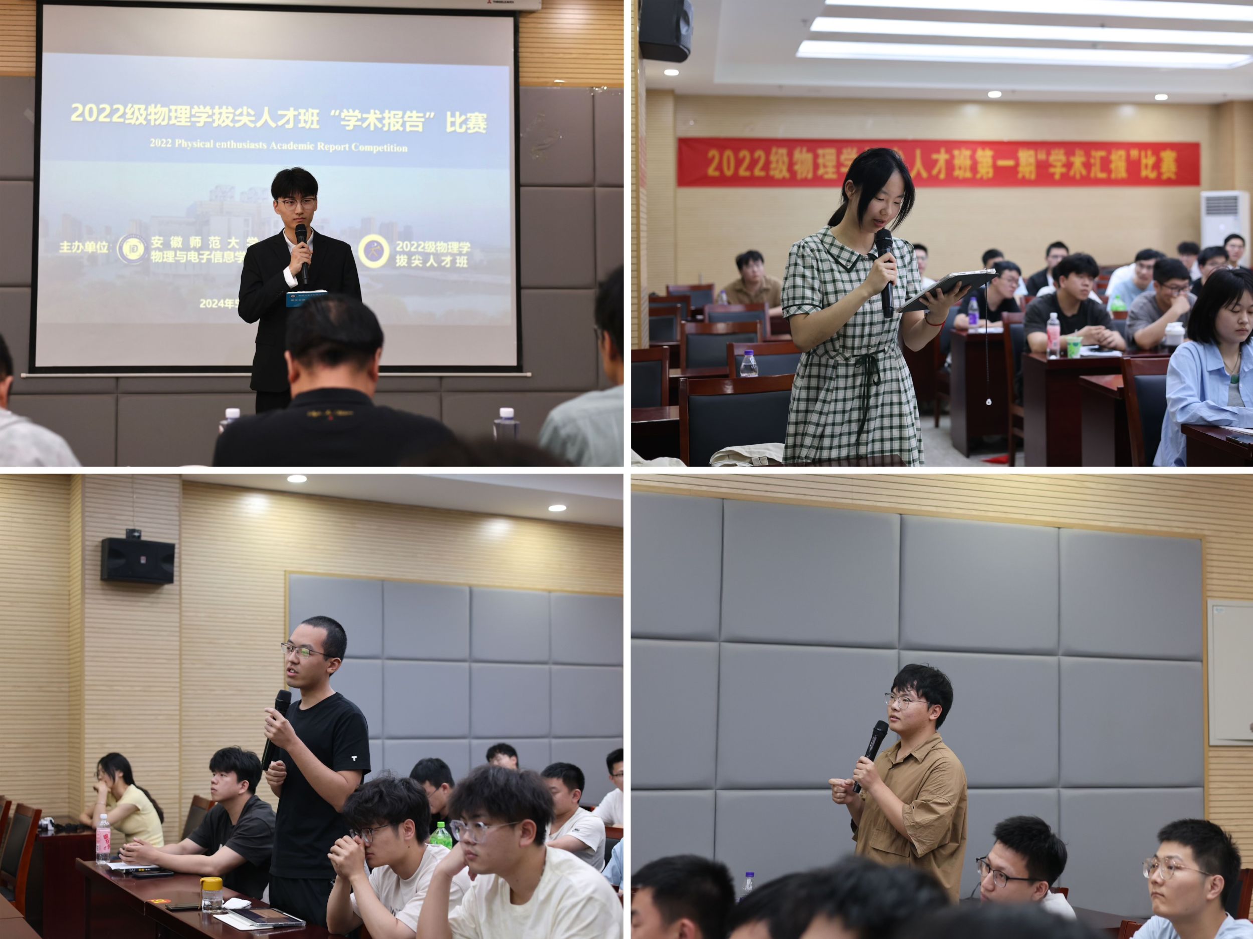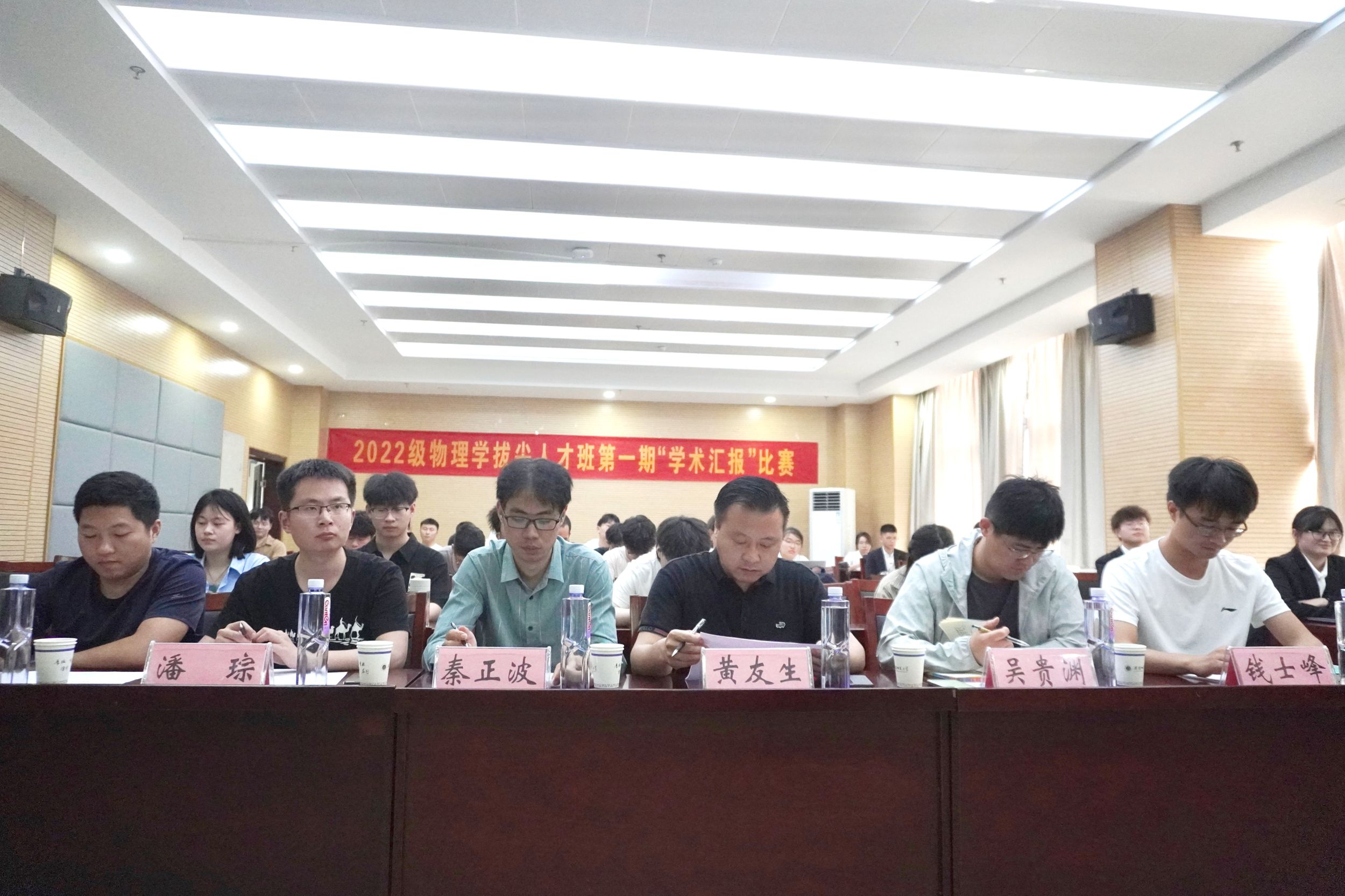 为贯彻落实学校“三大行动计划”,切实助力物理学拔尖人才班学生开拓学术视野、夯实科研能力、砥砺学术志趣。5月26日下午,必赢国际在物理楼335举办第五届物理学拔尖人才班“学术汇报”比赛,学院党委副书记黄友生、院物理学平台专业老师秦正波、吴贵渊、徐飞、潘琮、钱士峰担任评委,2022级物理学拔尖人才班赵文涵同学主持比赛,2022级物理学拔尖人才班全体同学观摩比赛。