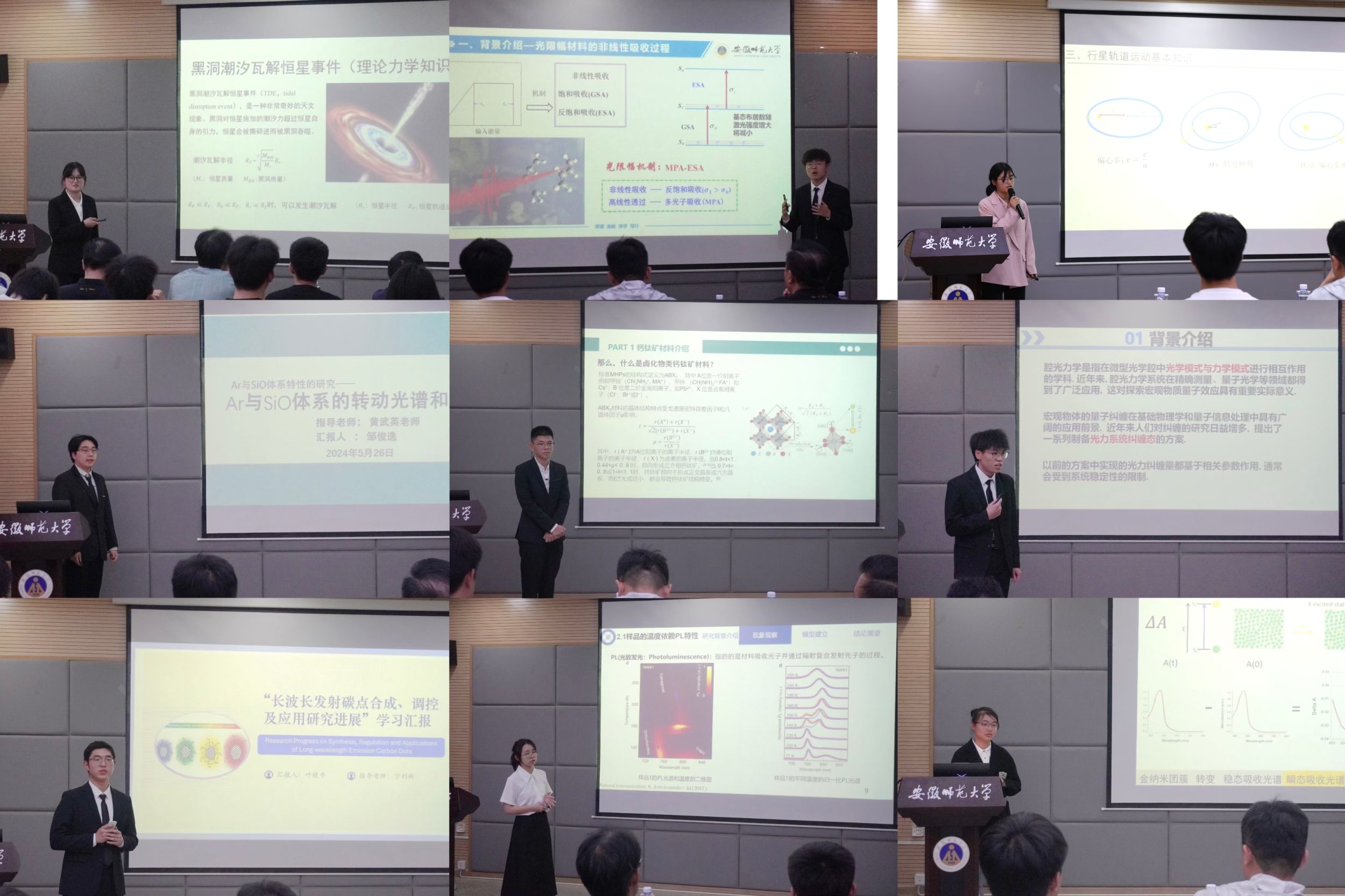 本次比赛通过现场汇报、评委点评、师生提问的方式进行,共有王紫琼、蒋承瑞、张莹、邹俊逸、周天翼、鲍晓岚、钱墉、叶健平、孙丹枫9位同学参与汇报,参赛同学依次上场展示了自己的科研训练结果。其中天体物理平台的王紫琼同学以课题《恒星被黑洞潮汐瓦解后出现的200秒准周期振荡现象》进行汇报,指出了nature文章中存在的笔误并验证了结果的置信水平。原子与分子物理平台蒋承瑞同学以各式激光引入,生动讲解了《聚集对酞菁锌结构和激发态吸收的影响》。理论物理平台的钱墉同学自学《高等量子力学》等课程,带来了题为《耦合光机系统中大量机械纠缠的耗散产生》的精彩汇报。评委老师对汇报同学的研究内容提供建议与指导,台下同学与选手提问交流互动。