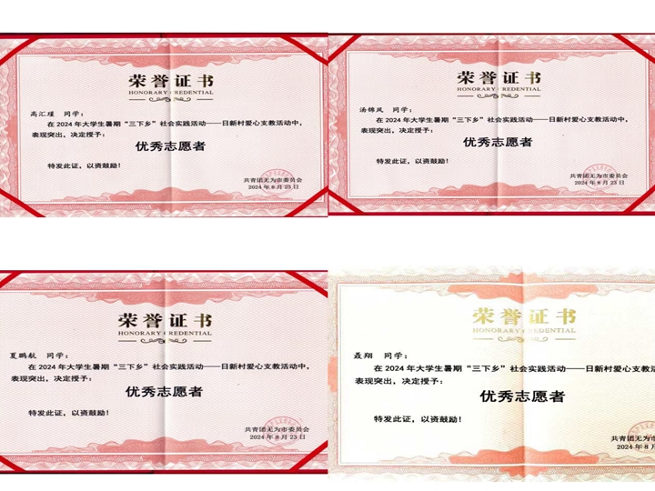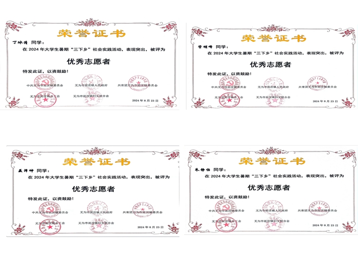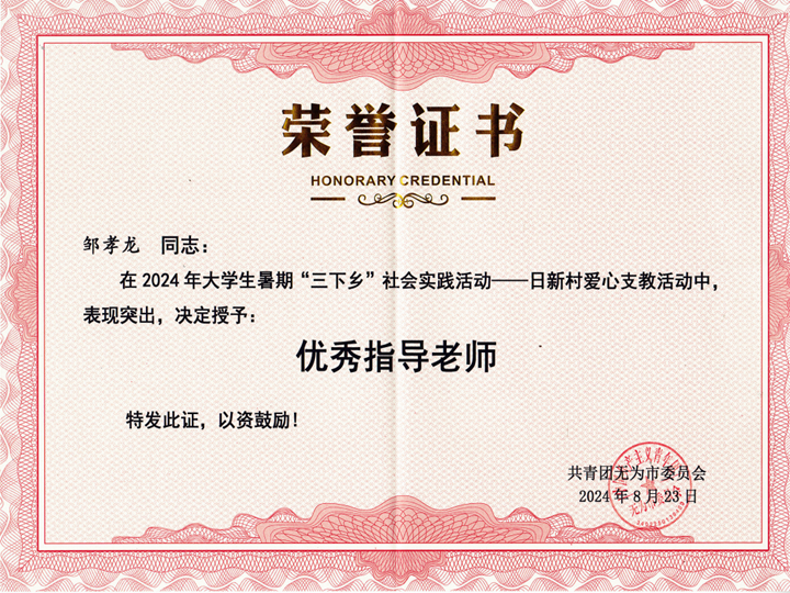 近日,团无为市委表彰我校“千方爱心学校”暑期社会实践团队师生。“千方爱心学校”暑期社会实践团队在2024年无为市大学生暑期“三下乡”社会实践活动中表现突出、成效明显,团无为市委决定授予“千方爱心学校”“优秀支教团队”称号,必赢国际辅导员邹孝龙被评为“优秀指导教师”,聂翔等同学被评为“优秀志愿者”。泥汊镇党委授予丁冰清等同学“优秀志愿者”荣誉称号。