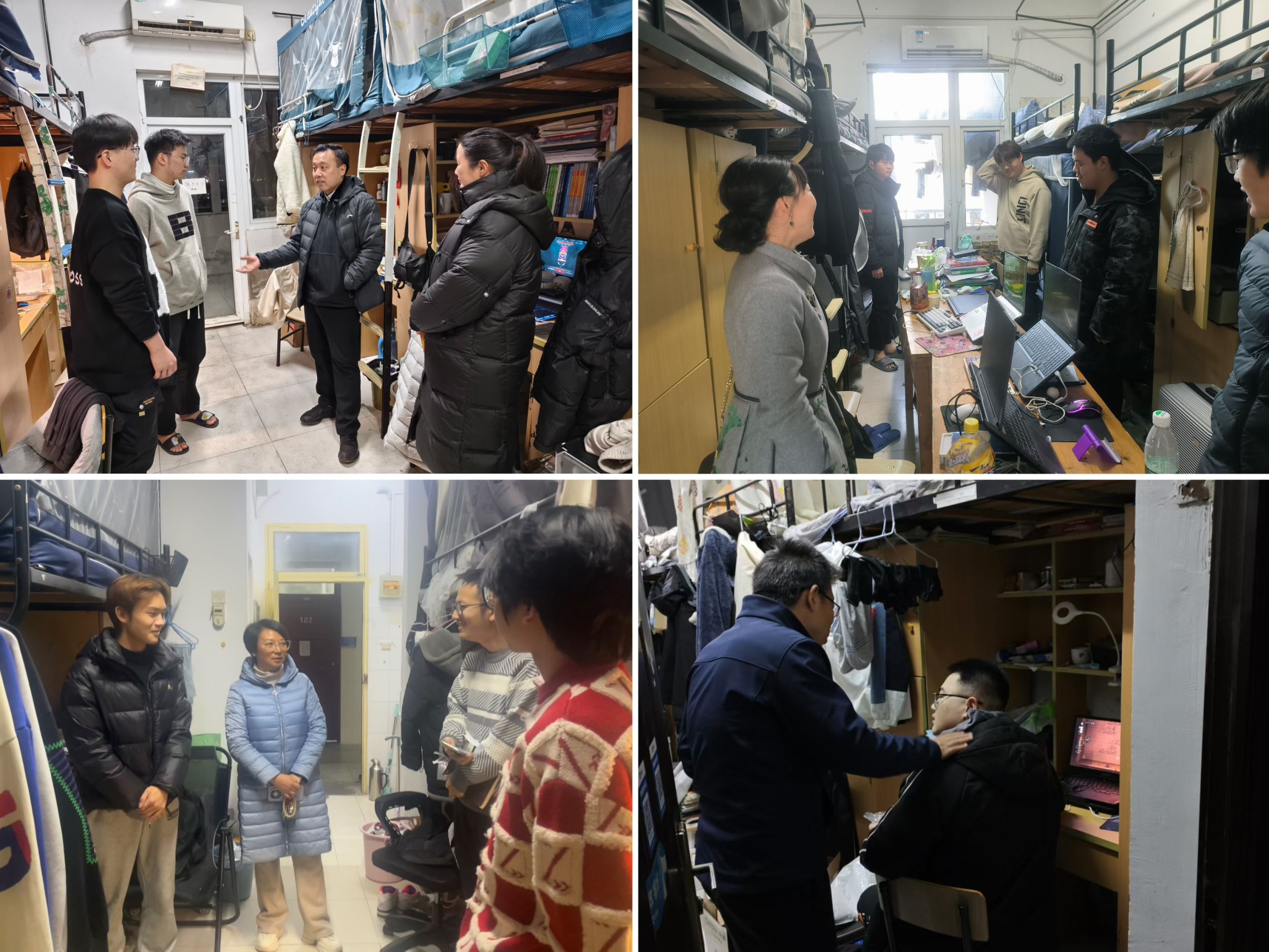 宿舍走访,消除安全隐患。学院领导班子成员、各年级班主任、辅导员分批次深入学生宿舍,重点排查寝室内务卫生、消防安全隐患等问题,提醒学生注意用电安全,严禁存放或使用违规电器,不私接、乱拉电线,不使用明火,共同营造安全、舒适的宿舍环境。并就期末季学习、思想、生活等方面与学生展开了亲切交流,叮嘱大家合理安排时间,做好复习计划。