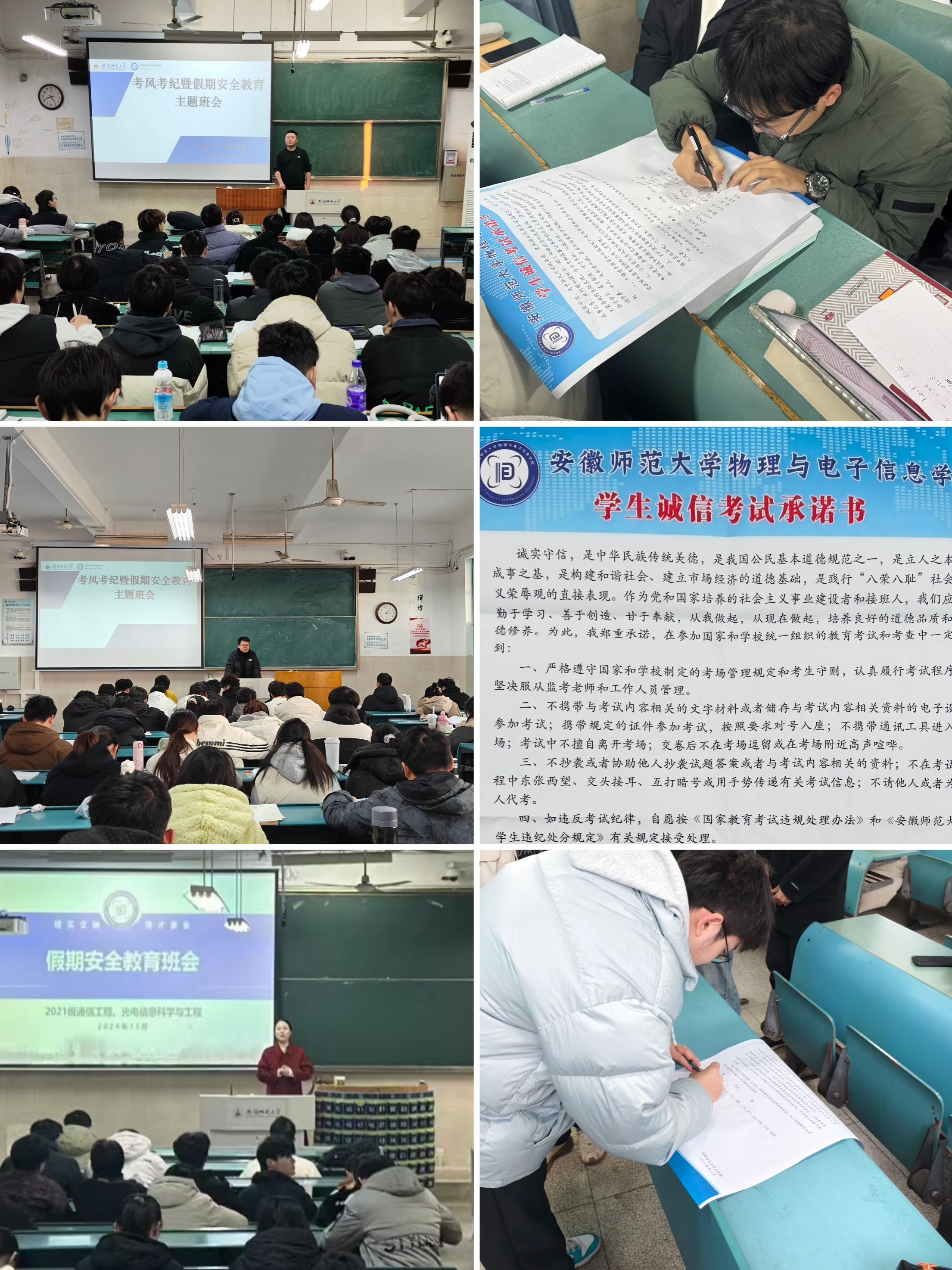 承诺践诺,营造良好氛围。各年级辅导员全覆盖开展考风考纪暨安全教育主题班会,提醒同学们规避风险,牢牢守住诚信底线和安全防线。班会上带领学生认真学习《必赢线路检测3003学生违纪处分规定(修订)》、《必赢线路检测3003普通全日制本科毕业生学士学位授予办法(修订)》的相关规定,现场组织全体学生阅读并签署诚信考试承诺书,同学们对个人、班级、学院、学校作出郑重承诺,自觉遵守考场规定,杜绝违规违纪行为的发生。