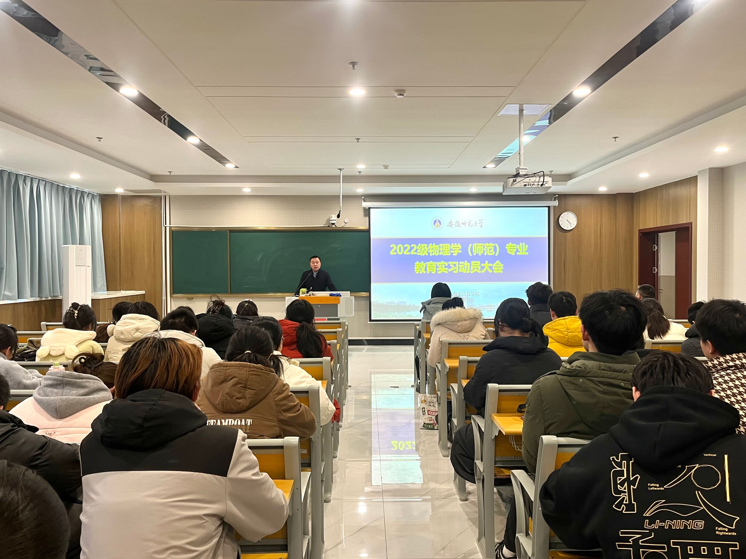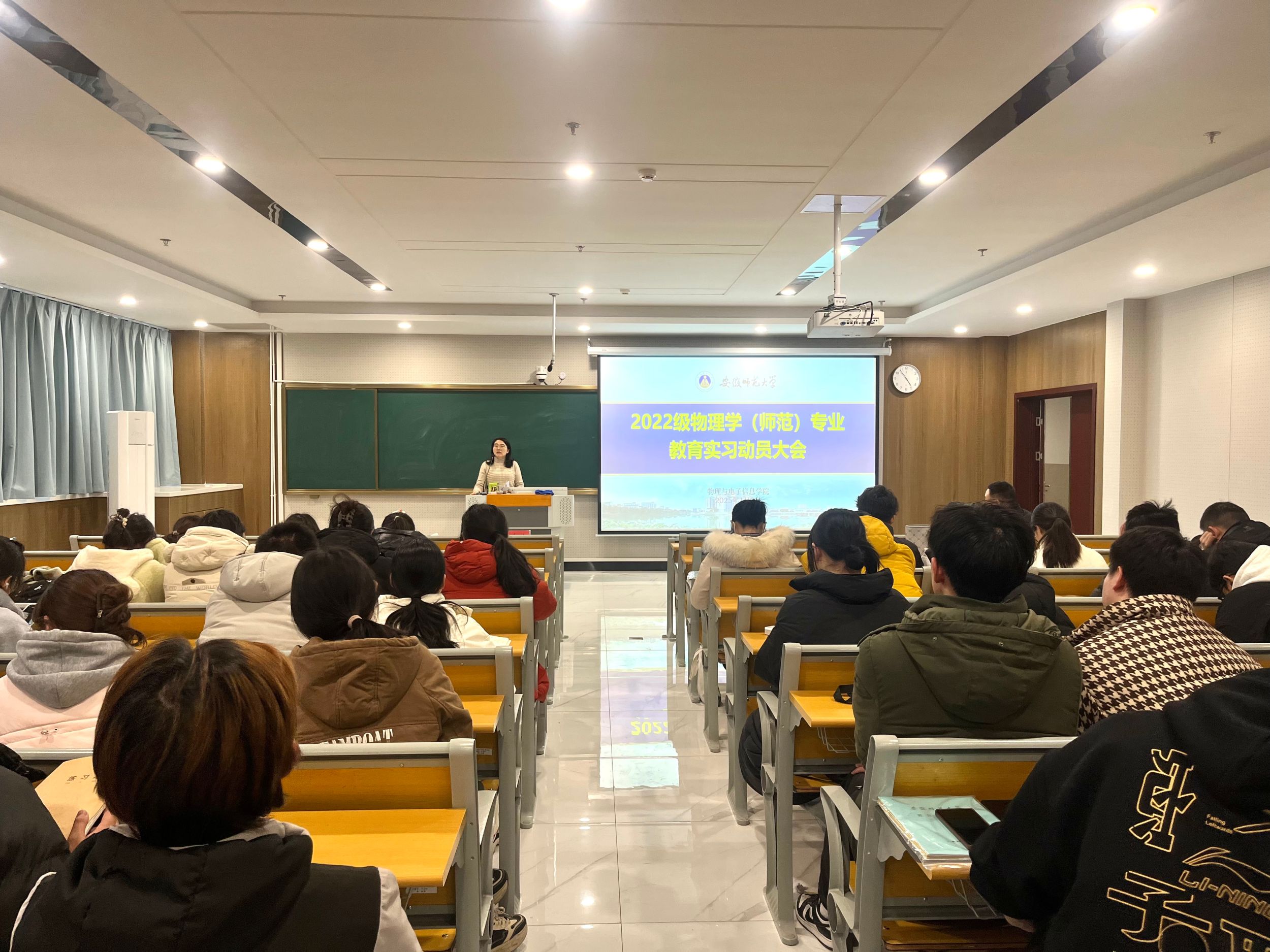 为深入落实基础教育振兴行动计划,切实做好师范专业教育实习工作,1月9日下午,必赢国际组织召开2022级物理学(师范)专业教育实习动员培训会。学院党委副书记黄友生,物理学专业副主任汪志荣,2022级物理学(师范)专业辅导员刘敏及全体学生参会,会议由学院教学副院长张爱清主持。