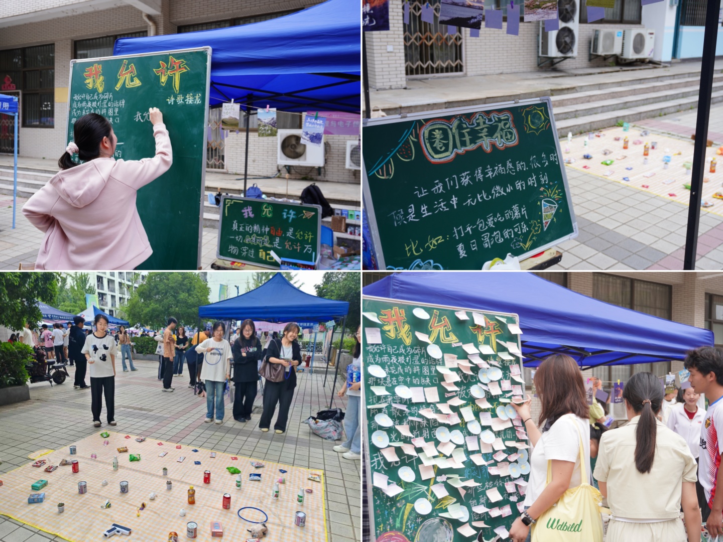 “以美润心”:艺术疗愈,润泽心灵。学院在学校心理健康中心的指导下,在二食堂广场开展了“我允许”“圈住幸福”趣味体验活动,旨在引导参与同学学会悦纳自我,并学会积极关注生活中的点滴幸福。活动吸引了众多同学驻足观看、排队体验。
