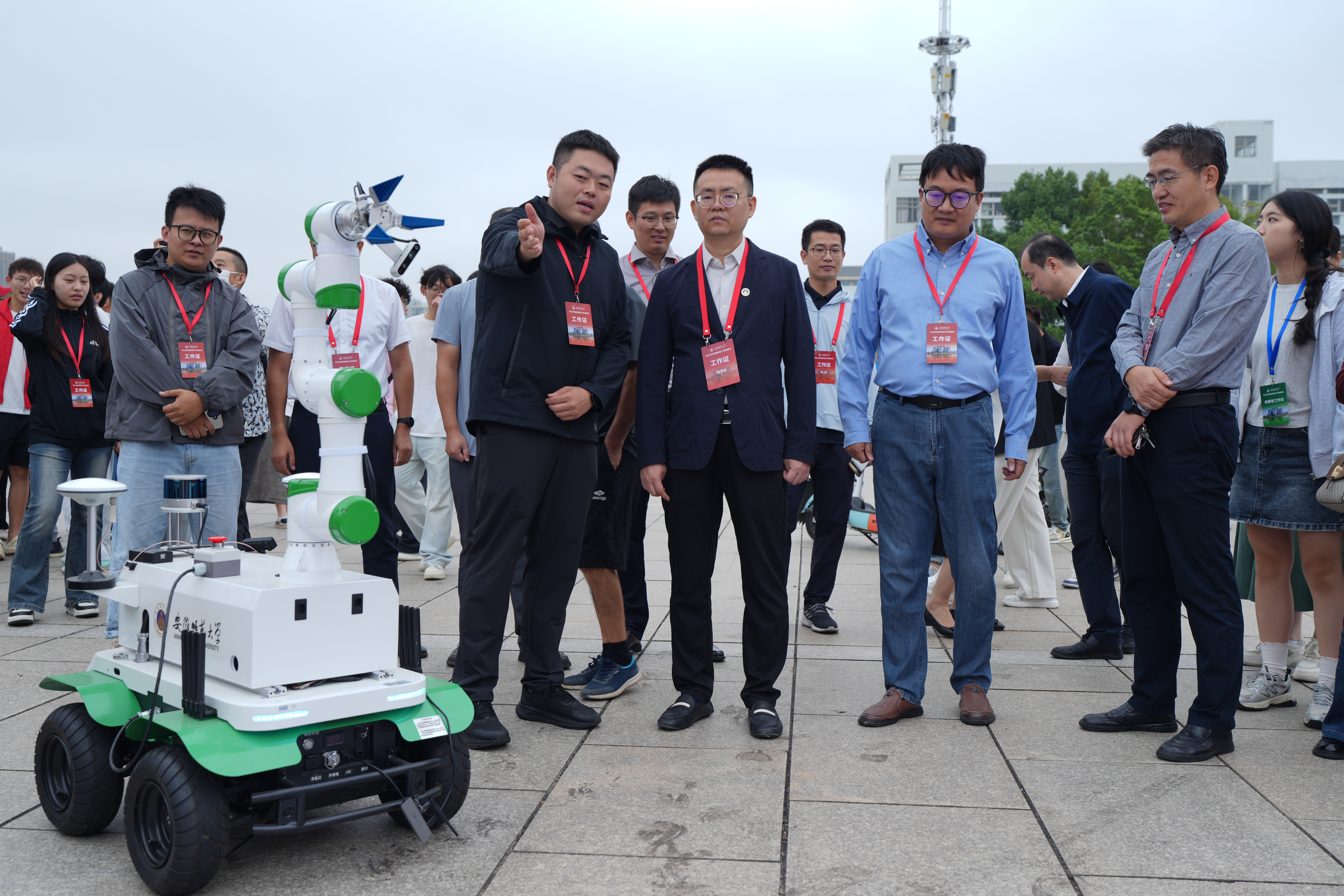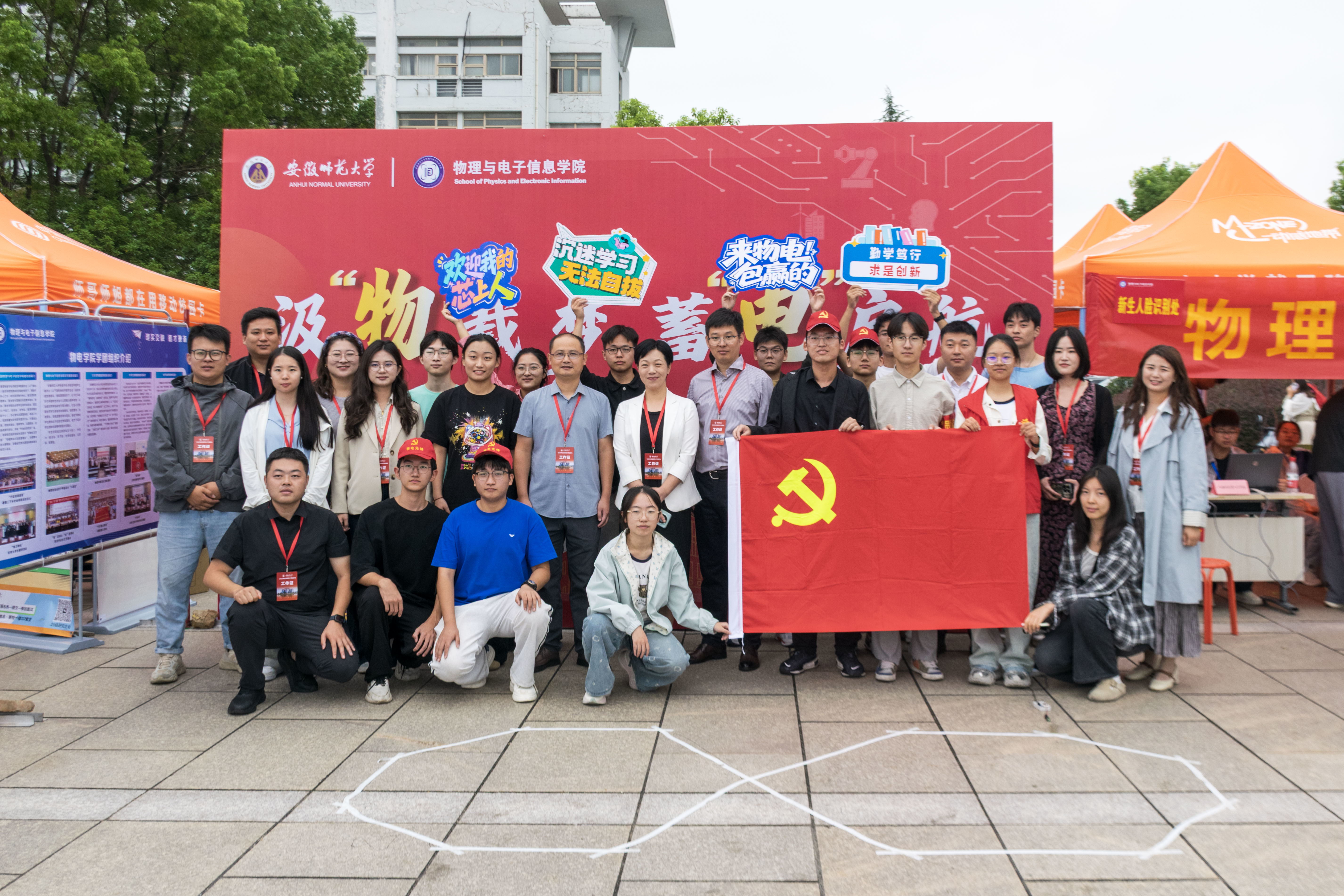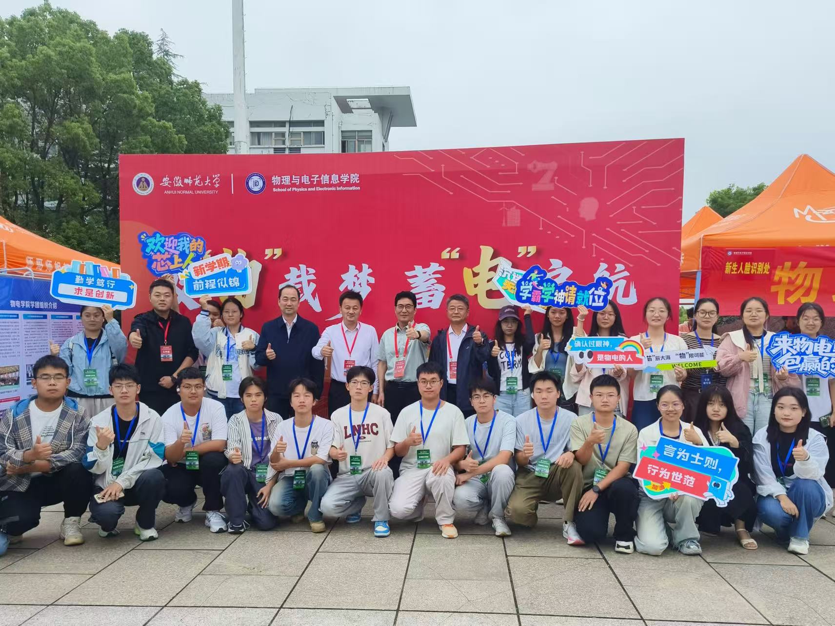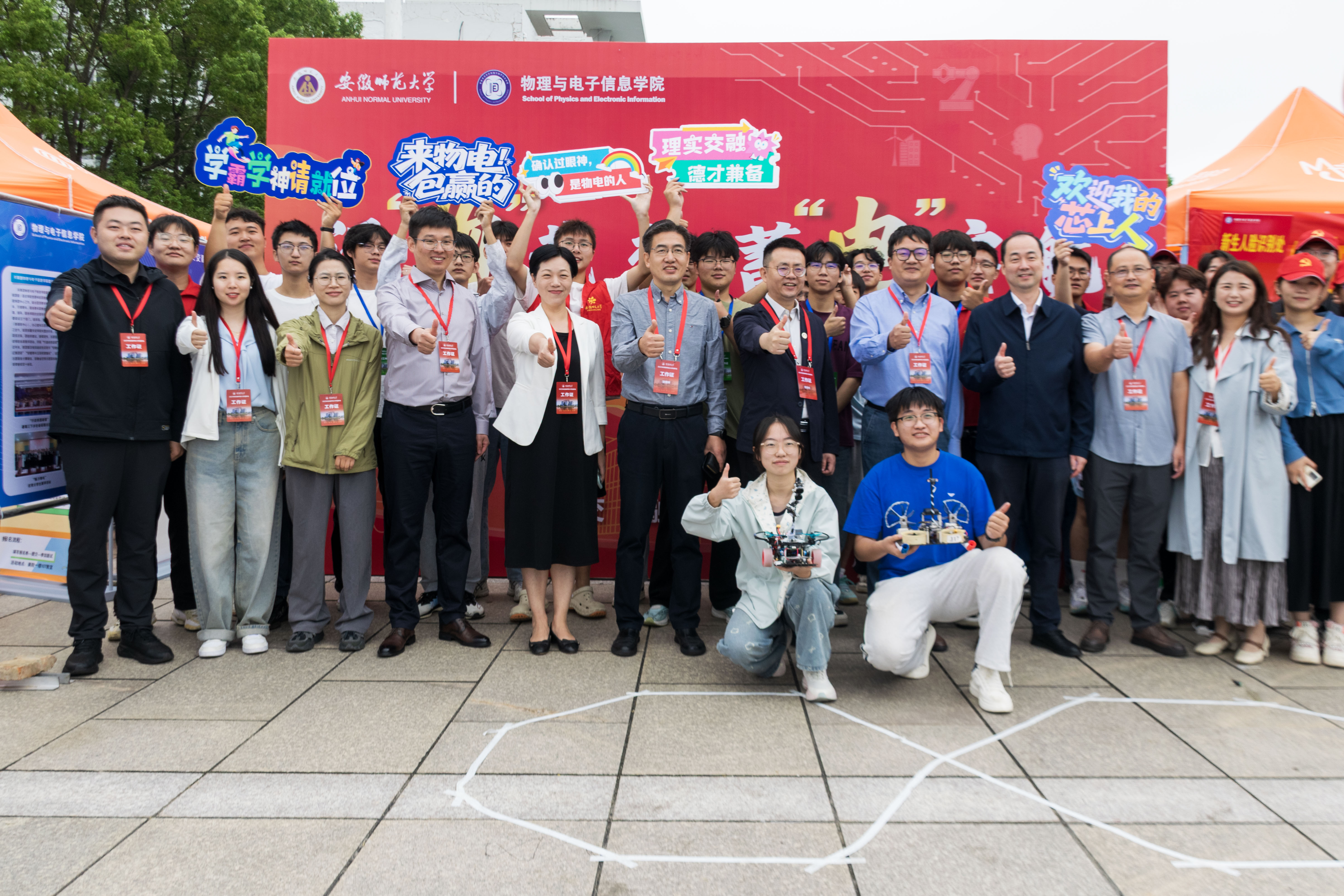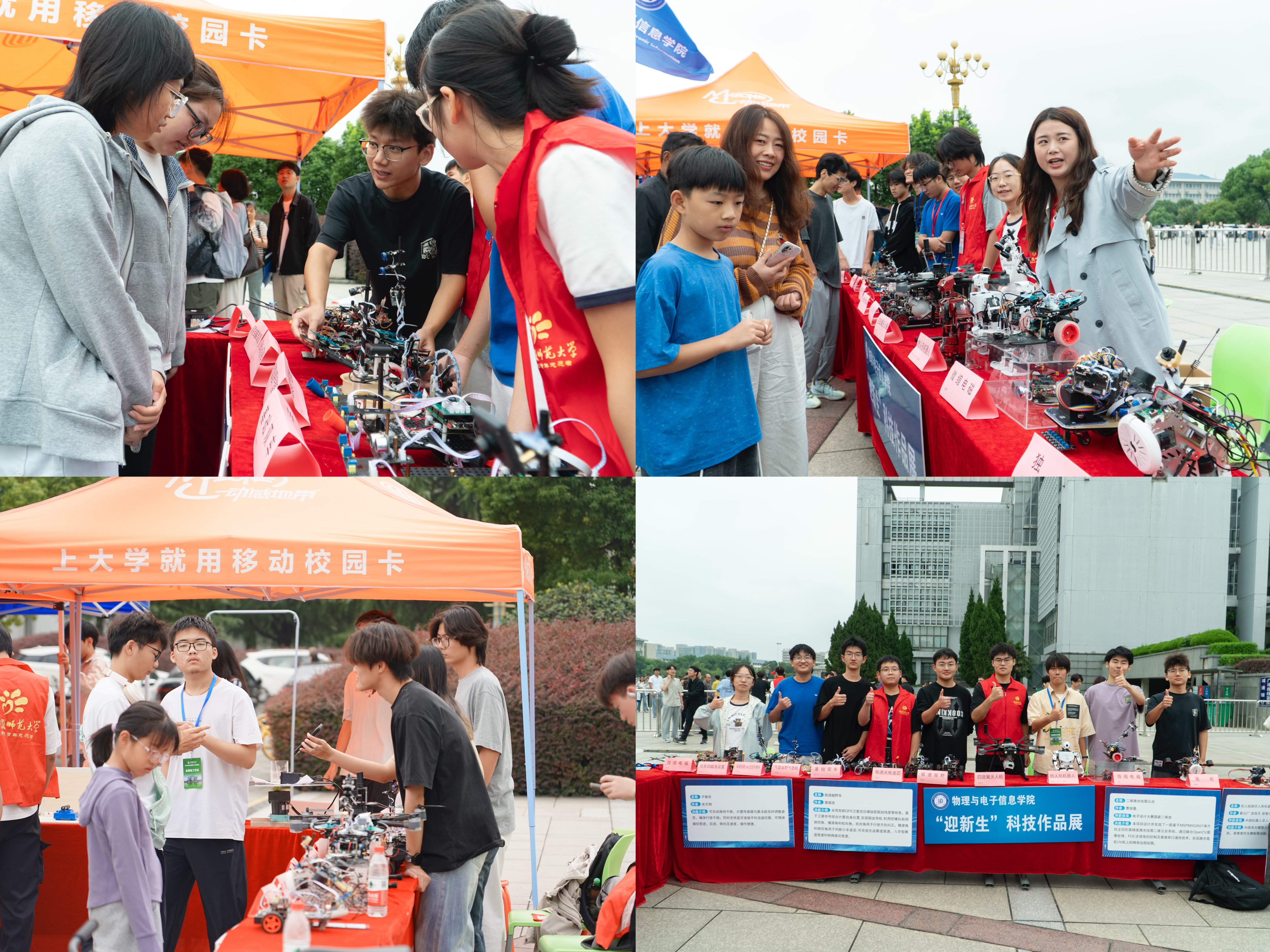 报到现场,学院设置“迎新生”学术科技作品展,集中呈现物电学子的创新成果。从仿人机器人、智能汽车、5G远程驾驶车、四旋翼无人机,到物理师范生自制的法拉第磁生电实验装置、受迫振动与共振演示仪等教具,门类丰富、创意十足。学生志愿者现场进行操作演示和专业讲解,帮助新生直观感受学科魅力,增强专业认同。现场还通过学院学团组织介绍、育人品牌项目展示、2025届考研光荣榜、学科竞赛光荣榜等宣传展板,进一步强化学风建设和专业思想教育。