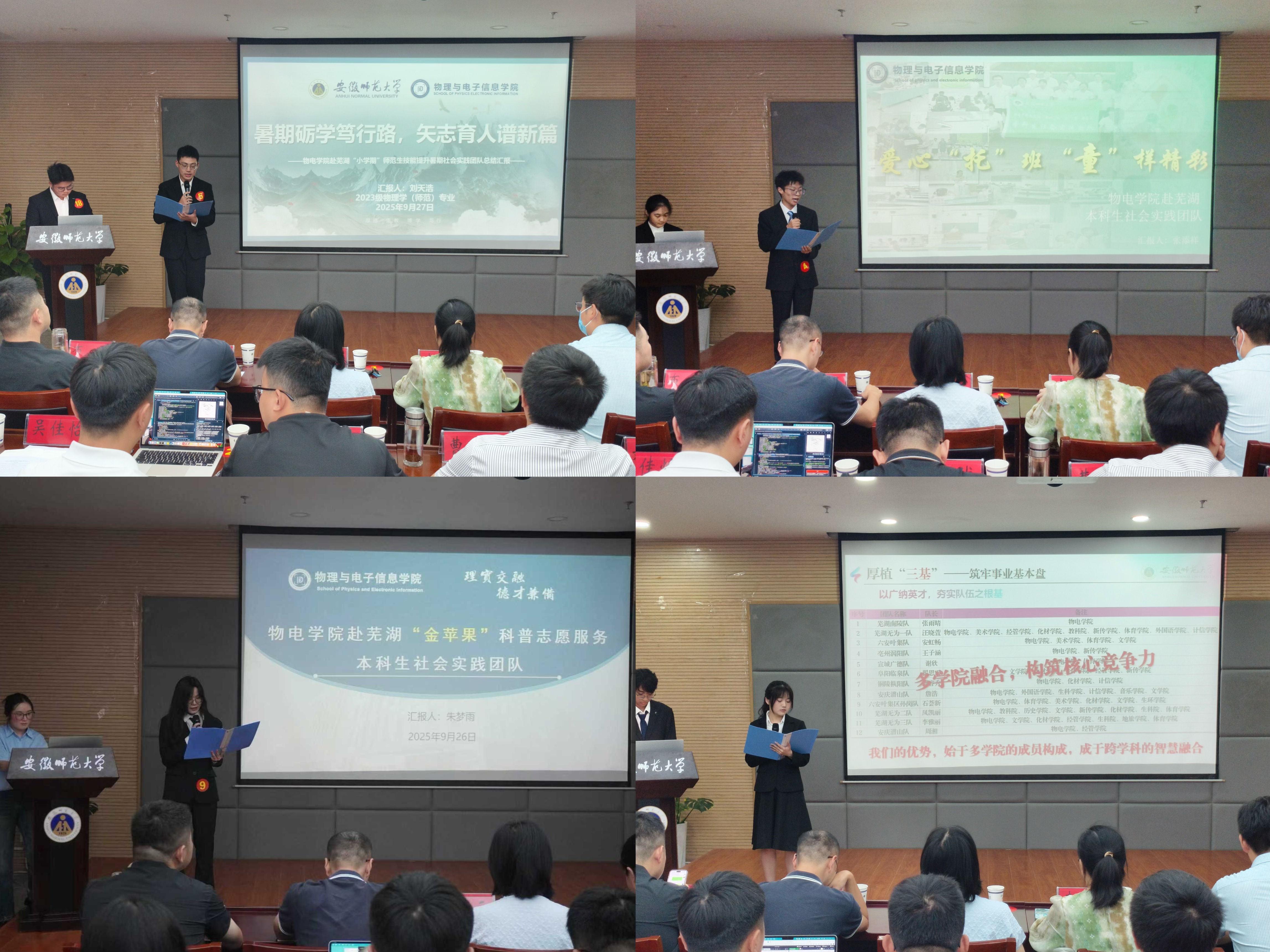 在暑期社会实践展评交流会上,10支重点实践团队的负责人依次登台,围绕前期部署、实践过程、成果收获与总结反思等方面,详实生动地分享了各团队的所见所闻、所思所获。“千方爱心学校”支教团队秉持“以爱为光,点亮希望”的信念,持续为乡村教育注入青春能量;“社区科技站”深入基层开展义务维修,以实际行动践行“科技创新,服务社会”的宗旨;“金苹果”科普项目依托专业优势,推动科普活动进社区、进学校、进企业、进乡村,广泛传播科学知识,弘扬科学精神;学科竞赛集训团队坚持“以赛促学、以赛促练”,不断夯实学生专业基础,提升实践能力,在国家级、省级赛事中斩获佳绩。这些丰富多彩的实践活动,生动展现了物电学子自强不息、知行合一、乐于奉献的精神风貌。