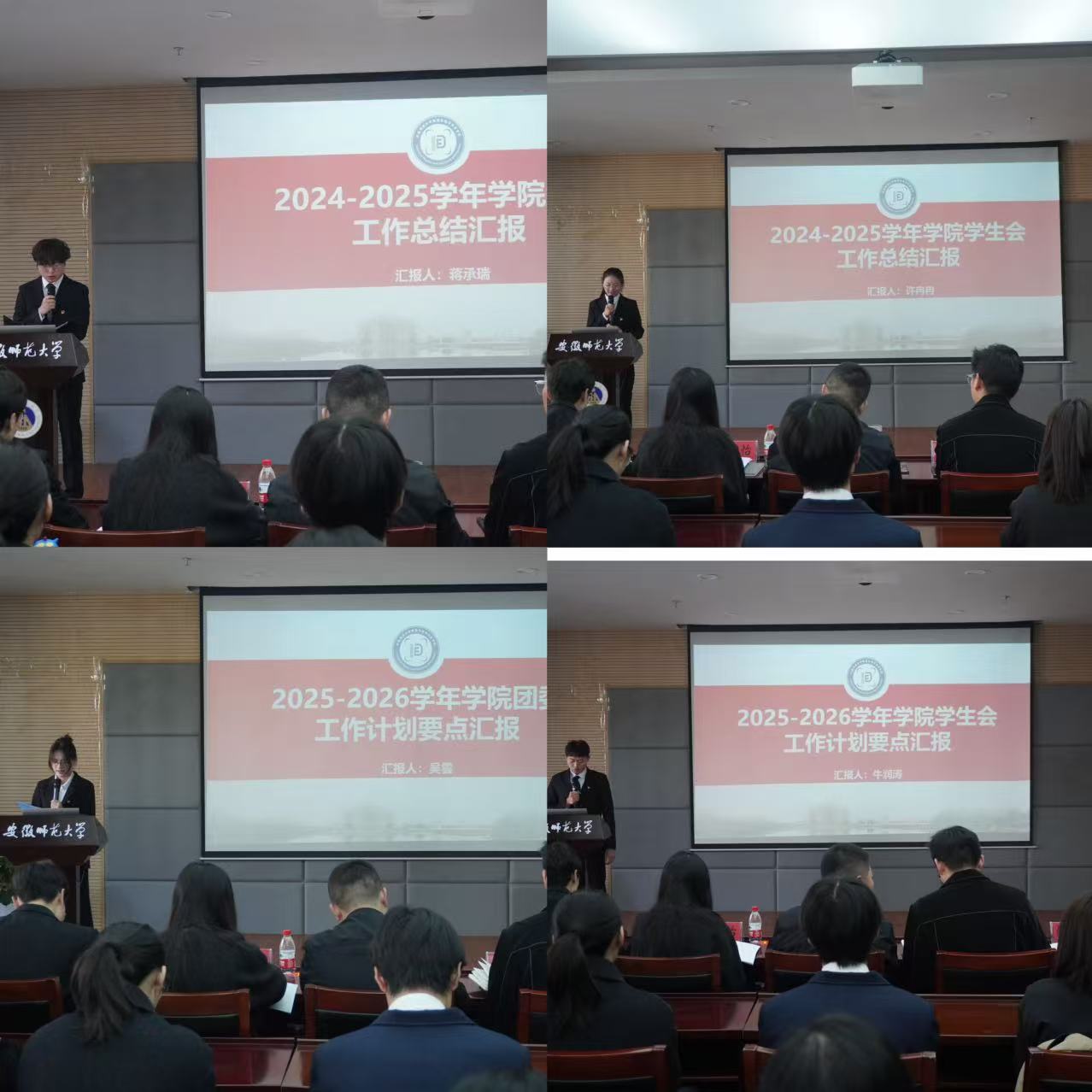 会上,院团委学生副书记蒋承瑞同学围绕深化思想引导、推进素质拓展、强化基础团建、繁荣校园文化等四个方面作2024-2025学年学院团委工作总结汇报;院学生会主席团成员许冉冉同学从组织建设力度、推进思想教育、提升品牌活动亮度等三个方面作2024-2025学年学院学生会工作总结汇报。院团委组织委员吴雲同学立足加强思想建设、推进素质拓展、夯实基础团建、坚持活动开展等四个方面作2025-2026学年学院团委工作计划要点汇报;院学生会体育部负责人牛润涛同学以坚定理想信念、坚守品牌理念、坚持活动开展等三个方面进行2025-2026学年学院学生会工作计划要点汇报。凌从祥、布赫、邹孝龙分别为2024-2025学年学院团委,学生会学生骨干颁发聘书;布赫、邹孝龙分别宣读了2025-2026学年团委、学生会成员名单。