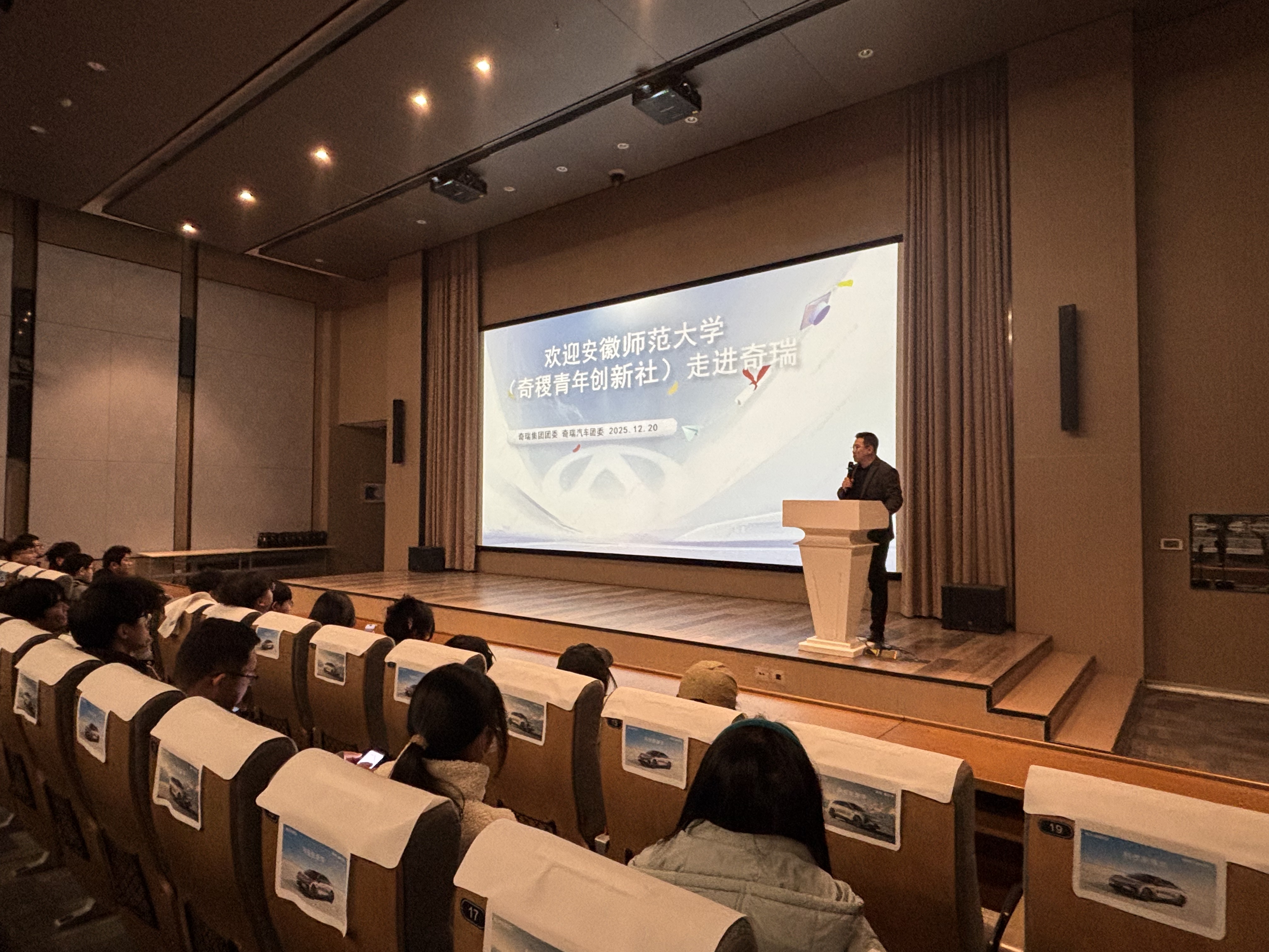 在汽研院大讲堂,奇瑞集团团委常务副书记沈永明为同学们开讲微团课。他以生动的故事娓娓道来,系统介绍了奇瑞的发展历程、产业布局与未来蓝图。这堂深入浅出的课程,让同学们对民族汽车的奋进之路与企业肩负的社会责任,有了更深切地体悟。