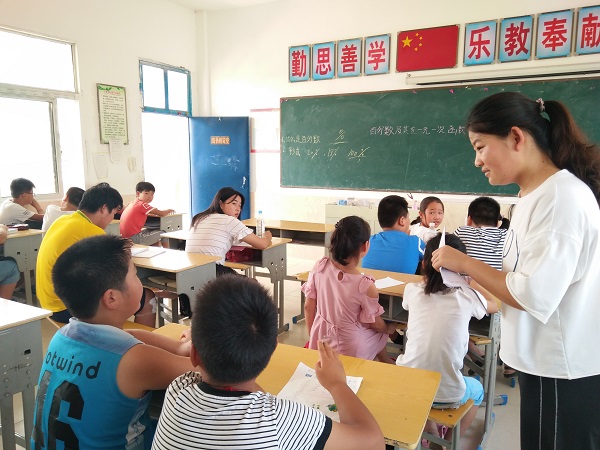 开班仪式后结束,授课大幕被徐徐拉开。上午剩下的两节课分别是李恰老师的数学和李东同学的语文。数学课上,李恰老师带领着同学们学习了百分数的相关知识,包括百分数的表示方法,百分数和分数的换算,特别强调了百分数都不能加单位;而在李东老师的语文课上则是带领同学们学习了杨万里的小池。泉眼无声惜细流,树阴照水爱晴柔。炎炎盛夏,一首小池给同学们送去凉意。下午,孙璨老师和同学们一起欣赏了萧县方言和寿县方言的美的同时,发现了普通话的重要性,之后在孙璨老师的带领下同学们用普通话介绍了自己的喜好和家乡。为了鼓励同学们积极发言,更是为她们准备了小红旗做奖励。普通话之后是作业辅导,课上,洪梦瑶、孙璨、苏进、刘兵鸽几位老师们为同学们解疑答惑,李恰老师更是专程赶来为同学们布置作业。至此,第一天的课程圆满结束。