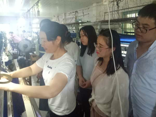 首先,工厂负责人向团队简单介绍了工厂的运营模式,生产流程和厂内工人的分工。 由于队员们对针织厂内的电脑横机操作非常感兴趣,工厂负责人就安排了几位工人分别带领几位队员学习电脑横机的简单操作。
