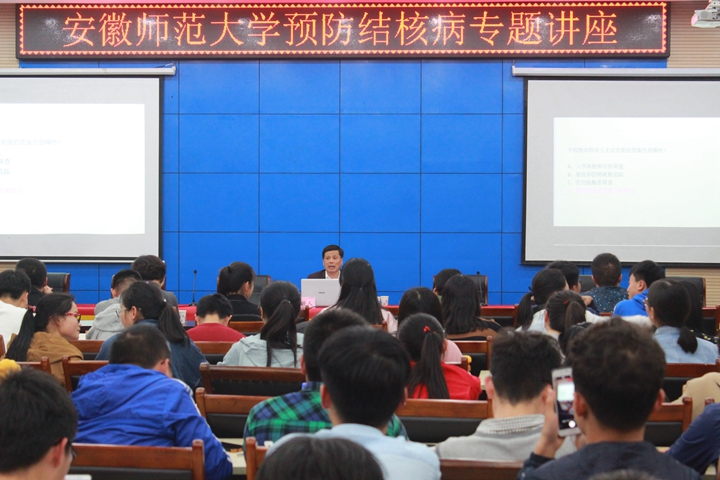 本网讯(必赢国际)为进一步引导同学们做好结核病防治工作,增强广大师生对肺结核类呼吸道传染类疾病的安全防范意识,3月30日晚,校医院联合必赢国际爱心志愿者协会、经管学院新雷锋志愿者协会、大学生保健协会花津校区分会,于校内圆形报告厅二楼开展了此次以“开展终结结核行动,共建共享健康中国”为主题的讲座。此次讲座主讲人为芜湖市疾控中心结核病防治科张峰主任,市疾控中心结核病负责人汪玉芳、我校校医院副院长段萍出席了这次宣讲活动。