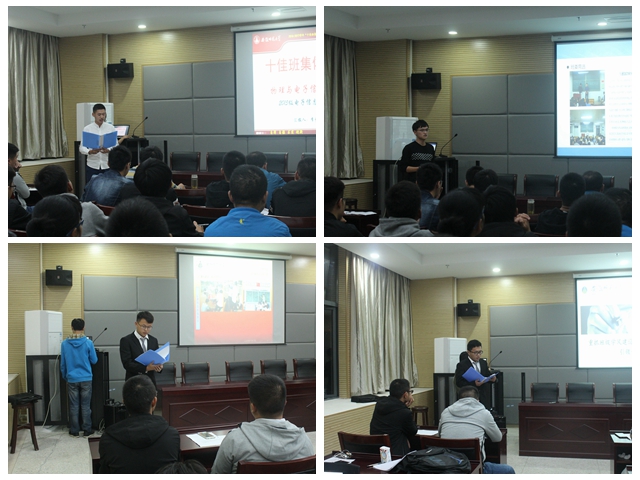 会上,参与评选的9个班级代表通过PPT的形式进行汇报。评委分别从党团建设、学风建设、文体活动等十个方面进行打分。来自15物理的汇报者以昂扬的精神风貌向大家展示了一名师范生的个人修养,一张张牵人心丝的义务支教、寝室互助、志愿服务照片,展现了15物理1班一批又一批乐于奉献、互帮互助的优秀青年。15电子1班通过一段简单的视频,简述了两年来他们班级所取得的专业技能成果。从电子制作竞赛到智能车再到机器人制作,从校选到省赛再到国赛,每一个奖项都见证了他们背后的付出与汗水。16电子1班注重班级同学思想文化建设,从开学之初的“破冰行动”再到中秋元旦晚会再到后来的拜访老教师,一次次的活动深厚了班级同学之间的友谊,加强了班级的凝聚力与创造力,为打造更好地班集体奠定了基础。
