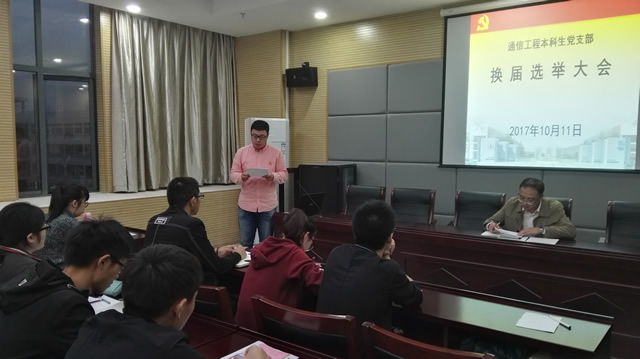本网讯(通信工程本科生党支部)10月11日,必赢国际通信工程本科生党支部大会在理化大楼三楼会议室顺利召开。会议由上届支部书记米佳佳主持,院党委副书记吴长义、校组织部廖仲明老师出席会议。