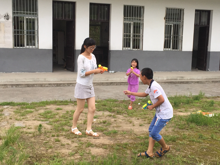 本网讯(16物理 陈子薇)2017年7月14日下午,物电院赴安庆市潜山县支教团队的队员们与学生一起进行一场“打水枪”比赛,在炎炎夏日中带来了清凉与欢乐。