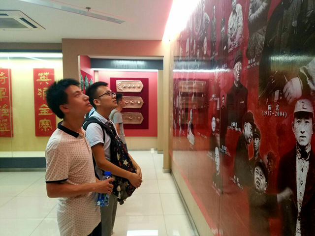 馆内陈列着从1924年6月金寨县麻埠大刀会起义至1949年全国解放各时期历史文物,这些简单朴实的文物让团队的每位成员都情不自禁地感叹那个充满艰辛的岁月。随后,团队来到了人物展厅,这里展出了金寨县各时期革命前辈的照片近200张,并附有他们的生平事迹简介,整个展厅气氛庄严肃穆。在革命先辈的英灵前,每个人都感受到了自身的渺小。