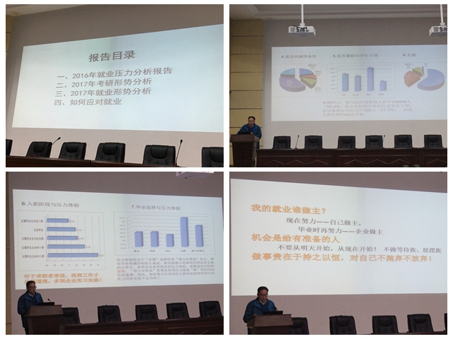 讲座从剖析《2016年大学生就业压力分析报告》入手,全面呈现了学历级别、有无学生干部及兼职经历等11个因素对大学生就业前后压力大小的影响;细致分析了近五年来毕业生就业压力、期望月薪、期望工作地点、去基层工作意愿以及毕业去向选择的发展趋势。吴长义指出,当前求职者主要有就业压力总体回升、期望月薪再次反弹、考研热情持续反弹、创业热情持续高涨等八大特点。对于在校的大学生来说,应当早规划、早准备,除了掌握过硬的专业技能之外,还应该注重沟通能力、抗压能力的培养和提升,全面提高个人综合素质,这样离开学校后可以更顺利地进入社会,更好地适应职场环境。