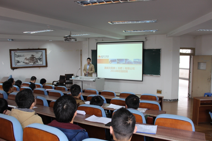 2016年3月23日早9点,通威集团来我院于综合楼三楼会议室进行2016年宣讲招聘会,招聘职位主要包括设备技术员、储备班组长、工艺技术员、研发助理工程师。我院大四毕业生们积极参加了此次招聘会。