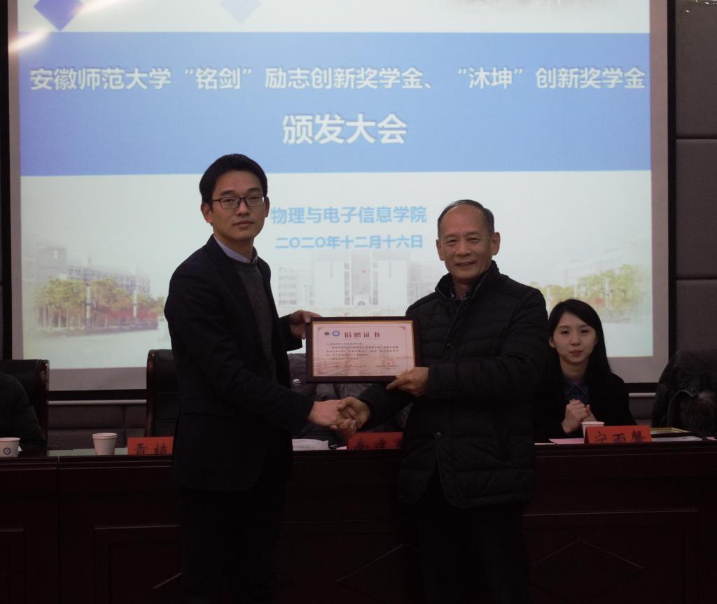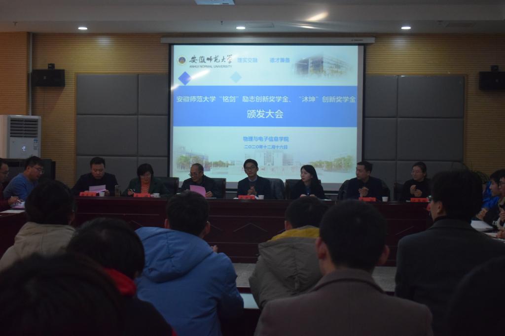 本网讯(必赢国际 汪光麒1216日下午,必赢国际“思源”爱心基金第一届“铭剑”励志创新奖学金、第二届“沐坤”创新奖学金颁发大会在物理楼335报告厅举行。上海铭剑电子科技有限公司总经理南建军、合肥沐坤科技有限公司董事长助理宁雨馨、苏州伏波电子科技有限公司公司常务副总经理黄聪、人力资源部部长沈嘉维、校教育基金会秘书长贡植斌、必赢国际党委书记李娟、院党委副书记黄友生和全体获奖同学参加了颁发大会。大会由黄友生主持。