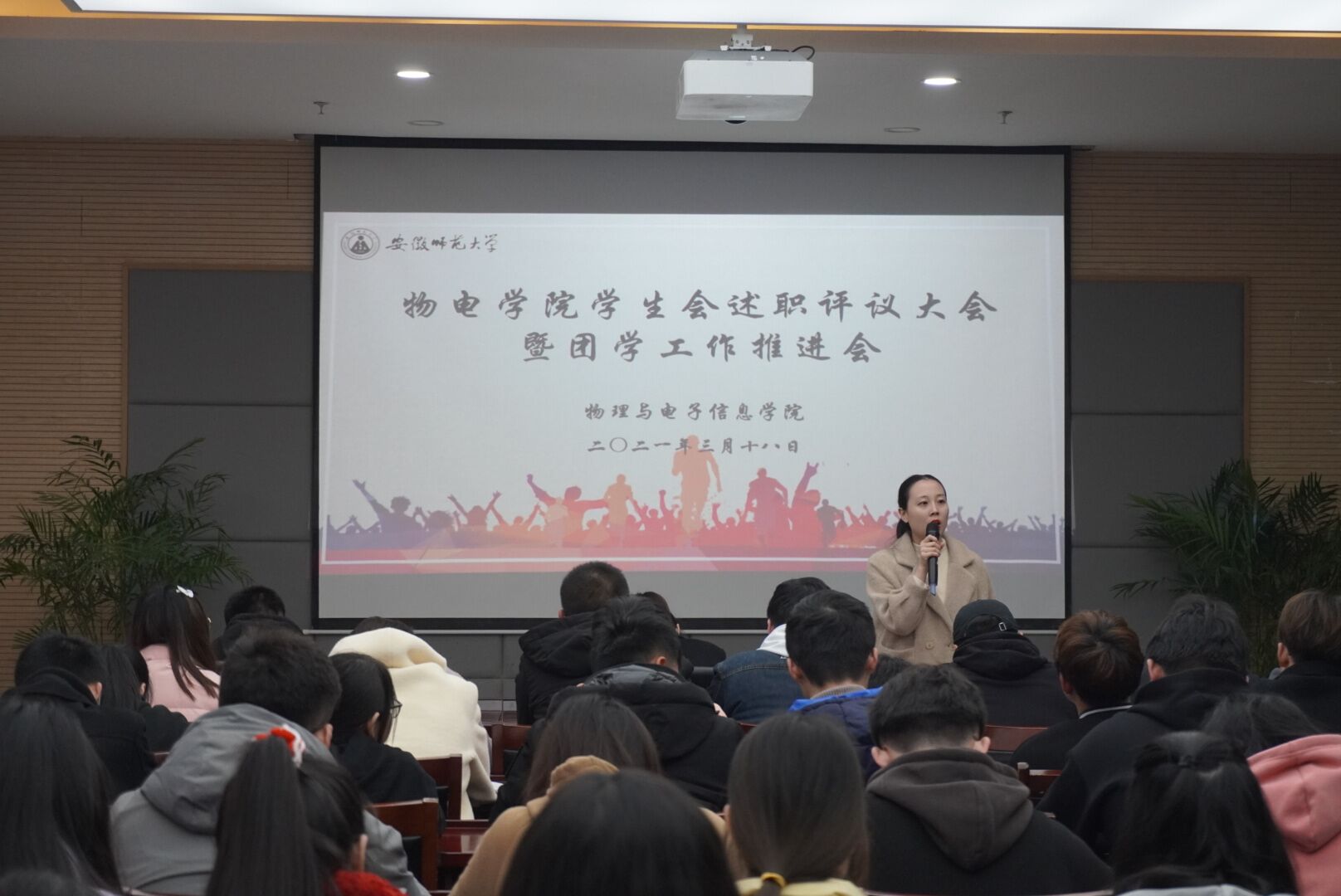 本网讯(必赢国际 宣传部)3月18日中午,必赢国际2020-2021学年学生会述职评议大会暨团学工作推进会于物理楼304报告厅举办。院团委负责老师刘冠琪、大学生物理爱好者协会指导老师邹孝龙、校学生会主席团成员王玥出席本次会议。学院20级各班班长、班委代表以及学院五大团学组织代表参加本次评议会。会议由院团委学生副书记李浩主持。