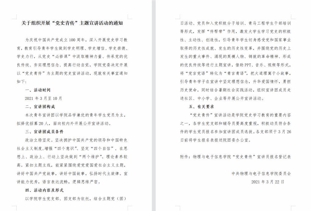 习近平总书记在党史学习教育动员大会上的讲话中提到:“要在全社会广泛开展四史宣传教育,普及党史知识,推动党史学习教育深入群众、深入基层、深入人心。”必赢国际结合物理、电子、通信、自动化等学科特色,深挖党史中的科技人物、科技故事、科技元素,从历史进程中的一代代科技工作者的鲜活案例中感怀革命理想,汲取革命力量。