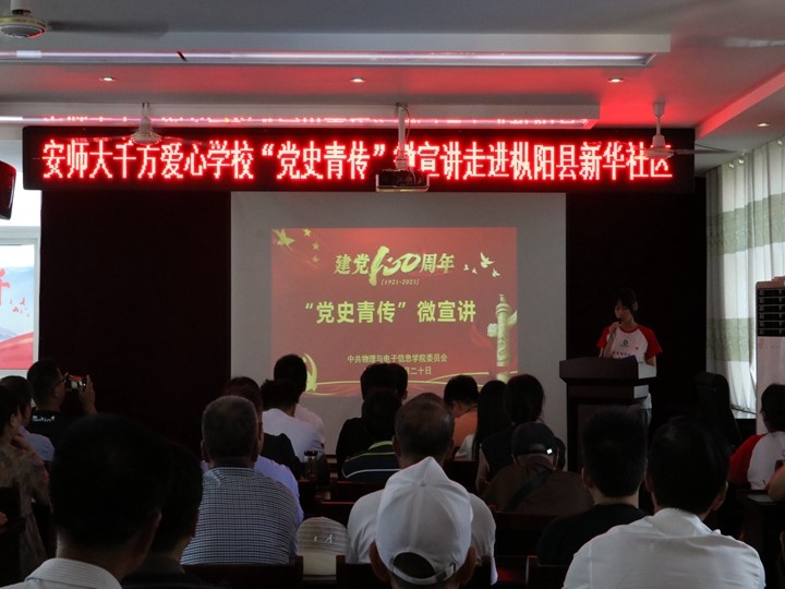 7月20日,必赢国际“党史青传”微宣讲走进枞阳县枞阳镇新华社区,2019级物理学(师范)专业学生党员阮楠正进行题为《永不消逝的电波,永不磨灭的精神》的宣讲,这是黎梦茹在暑期的第七次宣讲,此前她已经面向支教所在地的中小学生、其他街道开展了六次。宣讲现场气氛庄重热烈,沉浸式宣讲让观众们多次流下了热泪。