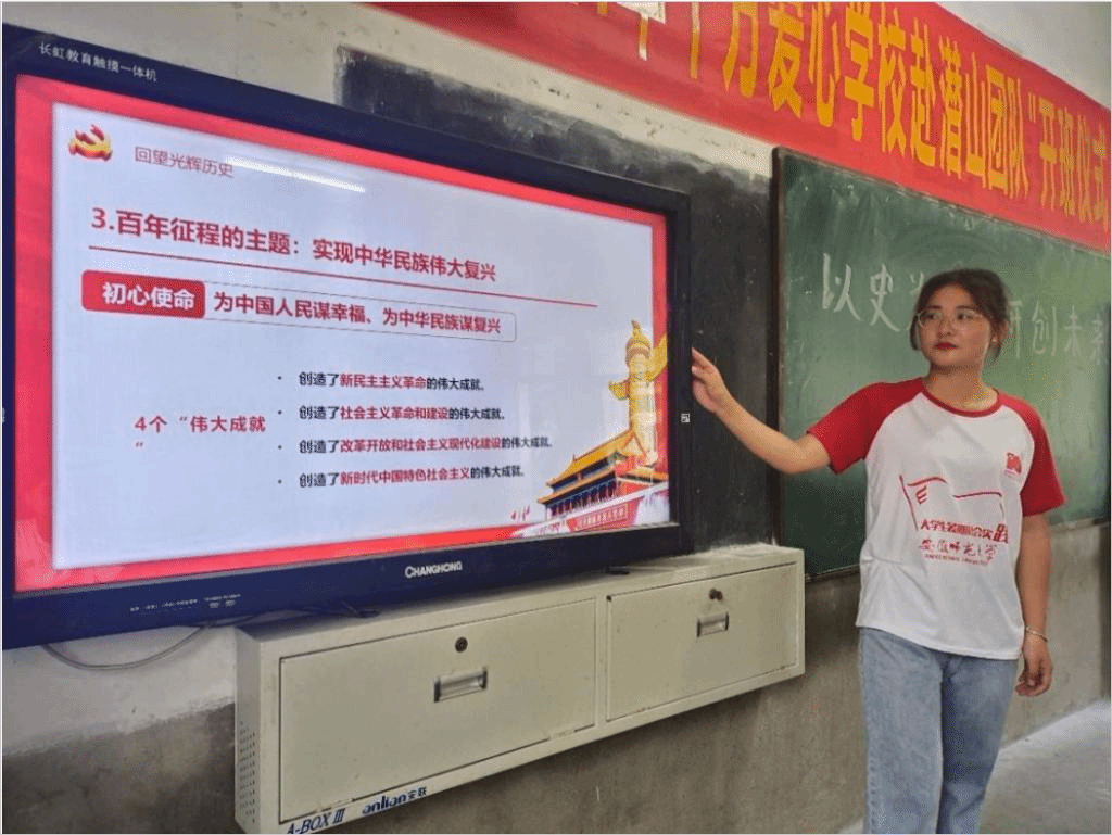 在潜山市昆仑中学支教点,千方爱心学校赴潜山支教团队队长陈翔宇正向孩子们讲述党史故事。“建国以后,面对经历百年洗劫的中国,满目疮痍,百废待兴,中国共产党领导全国各族人民,开始了国家需重建、民族要复兴的历史征程。这段路,有辛酸,有苦涩,有无奈,有坎坷,但是,结果却是充满了幸福甜蜜,政通人和!”。乡村未来的振兴与发展还要依靠这群在田野中长大、植根于土地之中的孩子们。必赢国际各支教实践团队积极开展“党史青传”微宣讲,为乡村孩子们树立坚定的理想信念,做到知史爱党爱国,知史明智担责,不啻微芒,用温暖点燃留守儿童梦的炬火。