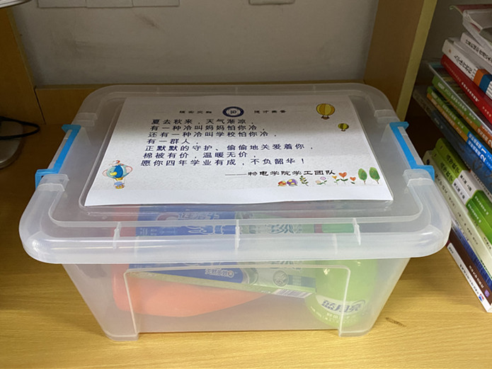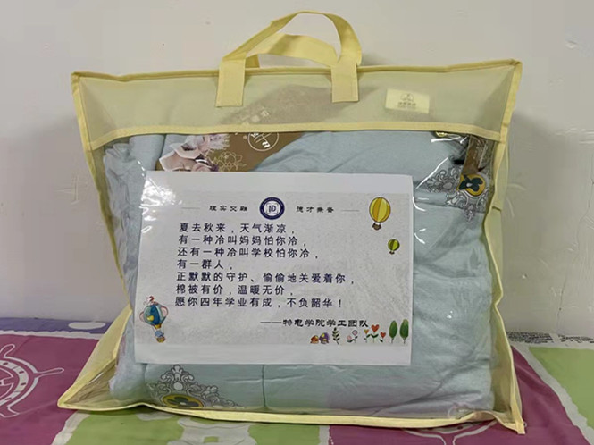 受益于学校学生工作处的智慧资助大数据平台,辅导员可以精准的掌握学生家庭经济情况的量化得分,并进行精准资助。为了减轻学生在校生活的经济负担,让学生切实感受到学校的关心爱护,学院沿用往年的做法,决定在天气转凉之季、学生返校之前,给2021级困难送去悄悄地温暖。学院学工团队在节前已做好棉被、洗衣液、沐浴露、牙膏、肥皂等生活物资的采购、分类打包,国庆期间,辅导员们悄悄地送到了学生宿舍,并附上学院学工团队温馨的祝福卡片,充分发挥资助育人功效。收到这份“惊喜”后,不少同学表示很感动,给辅导员回复信息说:“谢谢老师,你们给予的关心,我会铭记于心,将来我有能力的时候也一定会将这份爱心传递下去。”