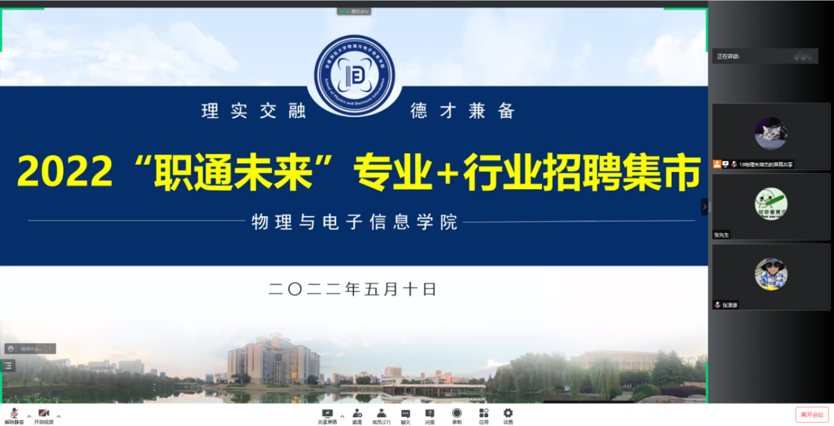 会上,五家企业的招聘负责人以企业发展史为切入点,由浅入深,层层递进,对员工福利、员工培训、员工薪资以及员工生活等都作了详细讲解,全方位的向参会毕业生展现了公司面貌与精神价值观。线上同学认真聆听,并就专业岗位适配度、工作内容、职业发展培养、薪酬待遇等方面与招聘人员进行了热烈的连麦交流。会后,学院统一收集各专业有意向学生简历并集中投递,五大公司将在后期陆续开展面试。